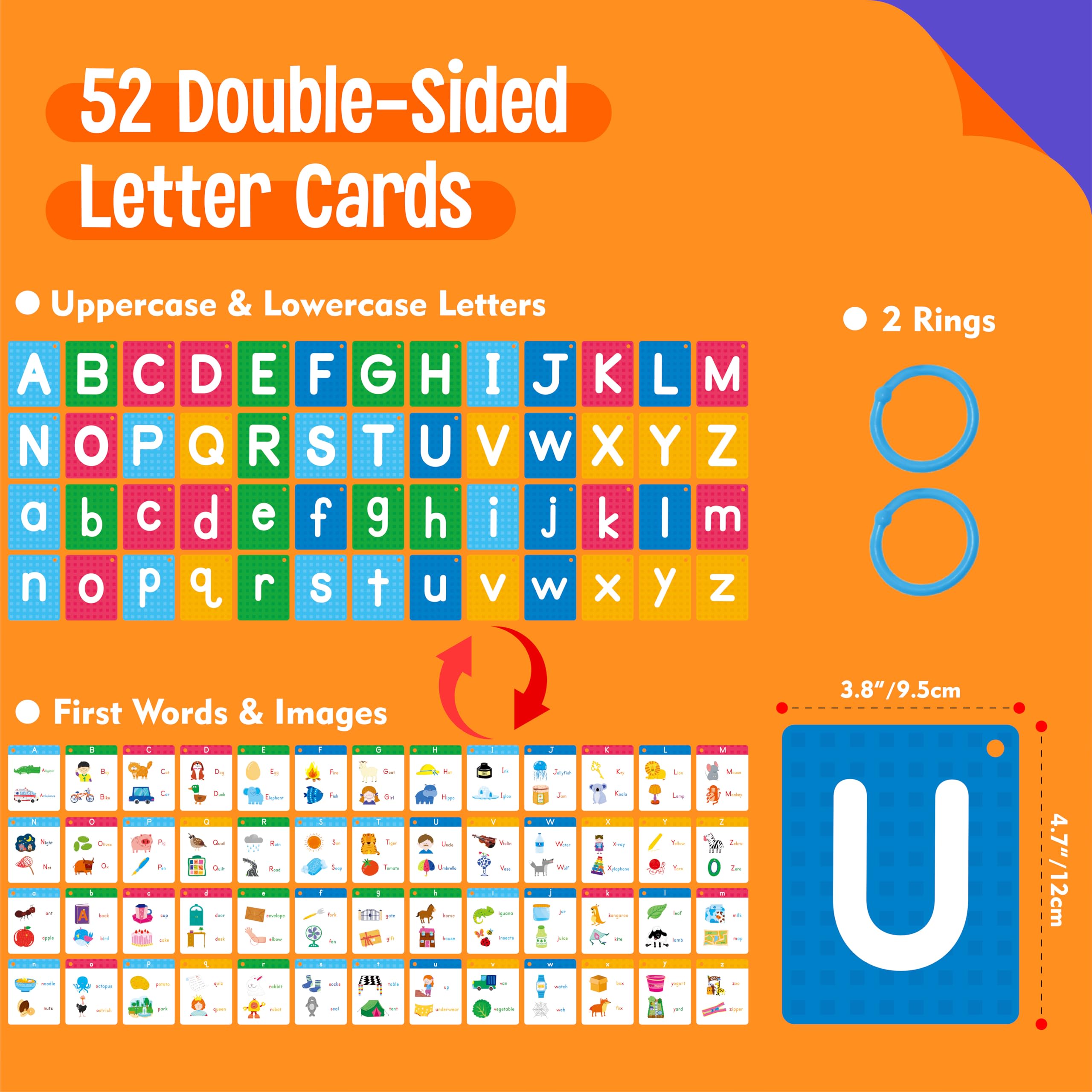 - Compact and Travel-friendly Design: Each card measures 4.7″ x 3.8″, perfectly sized for little hands. The set comes with 2 durable rings that keep the cards organized and portable, making it easy to take them along for learning on the go. Perfect for car rides, waiting rooms, or outdoor activities.