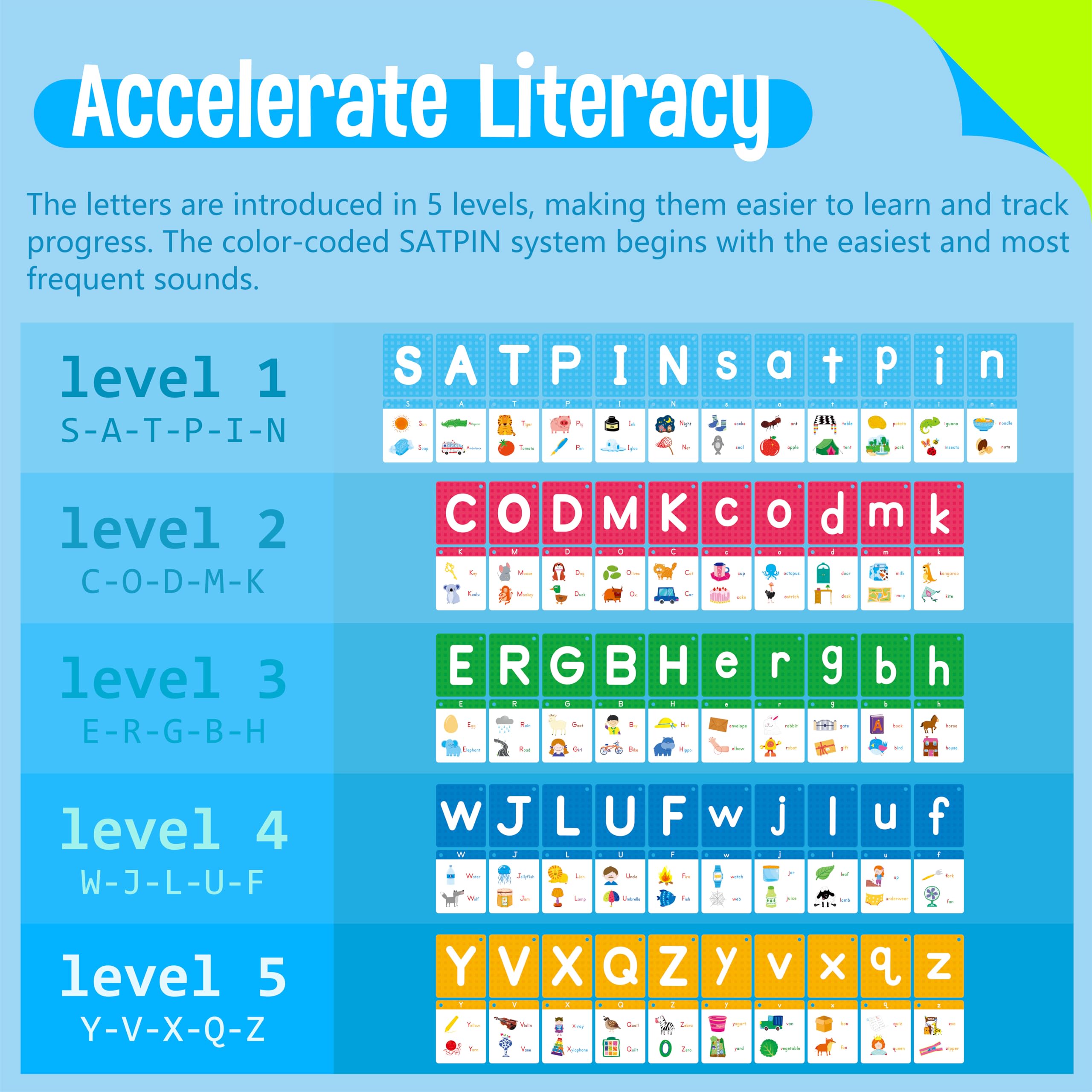 - Color-coded SATPIN System: Designed with the SATPIN system, these flashcards introduce the alphabet in five progressive levels, starting with letters that have the most common and easiest sounds. The color-coded design helps children visually distinguish the groups, making letter-sound association and recognition a breeze.
