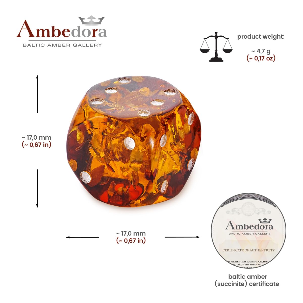 AMBEDORA Amber Dice, Pack of 1, Luxury Play Throws, Size 17 x 17 mm, Premium Amber