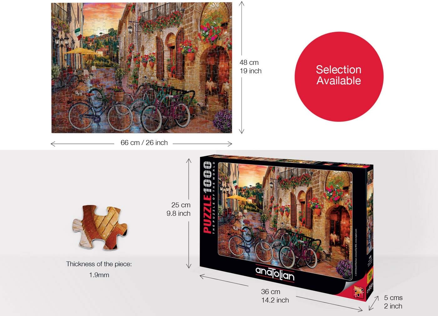 PRODUCT SPECIFICATIONS ➤BrandAnatolian ➤MaterialEska Board (High quality blue board, 100% recycled fibres and lays flat and stays flat) ➤Product Name BIKING IN TUSCANY Jigsaw Puzzles for Adults 1000 Pieces for Adult Children Puzzle ➤Dimensions48 x 66 cm / 19″ x 26″ inches ➤Box Dimensions36 x 25 x 5cm / 14.2″ x 9.8″ x 2″ inchesMORE DETAILS? Our Anatolian HIGH-QUALITY adult puzzles are even perfect as a floor puzzle for adults, teenagers, families, and friends to spend time together as a team building, challenging and an enjoyable exercise. ? We pride ourselves in customer satisfaction, hence the STURDY BOX is wrapped by a heat-shrinkable film. If the puzzle box shows any sign of damage, please contact us for a replacement. ? THICK AND STURDY PIECES make assembling Anatolian Puzzles smooth, fun, and relaxing experience. Colour of the pieces will remain fresh even after long term storage. ? The difficult puzzle games are great for exercising the left and right side of the brain at once. They also improve visual-spatial reasoning and assist in improving short term memory. Studies show that puzzle games for adults is a great meditation tool and stress reliever. So why wait …!!! Just scroll up and ADD TO THE CART and enjoy your 1000 piece puzzle. SAFETY WARNINGS Attention!!! Not suitable for children under 3 years of age due to small jigsaw pieces. i.e choking hazard.