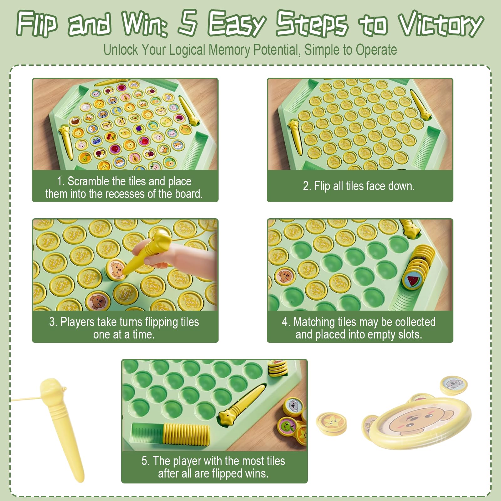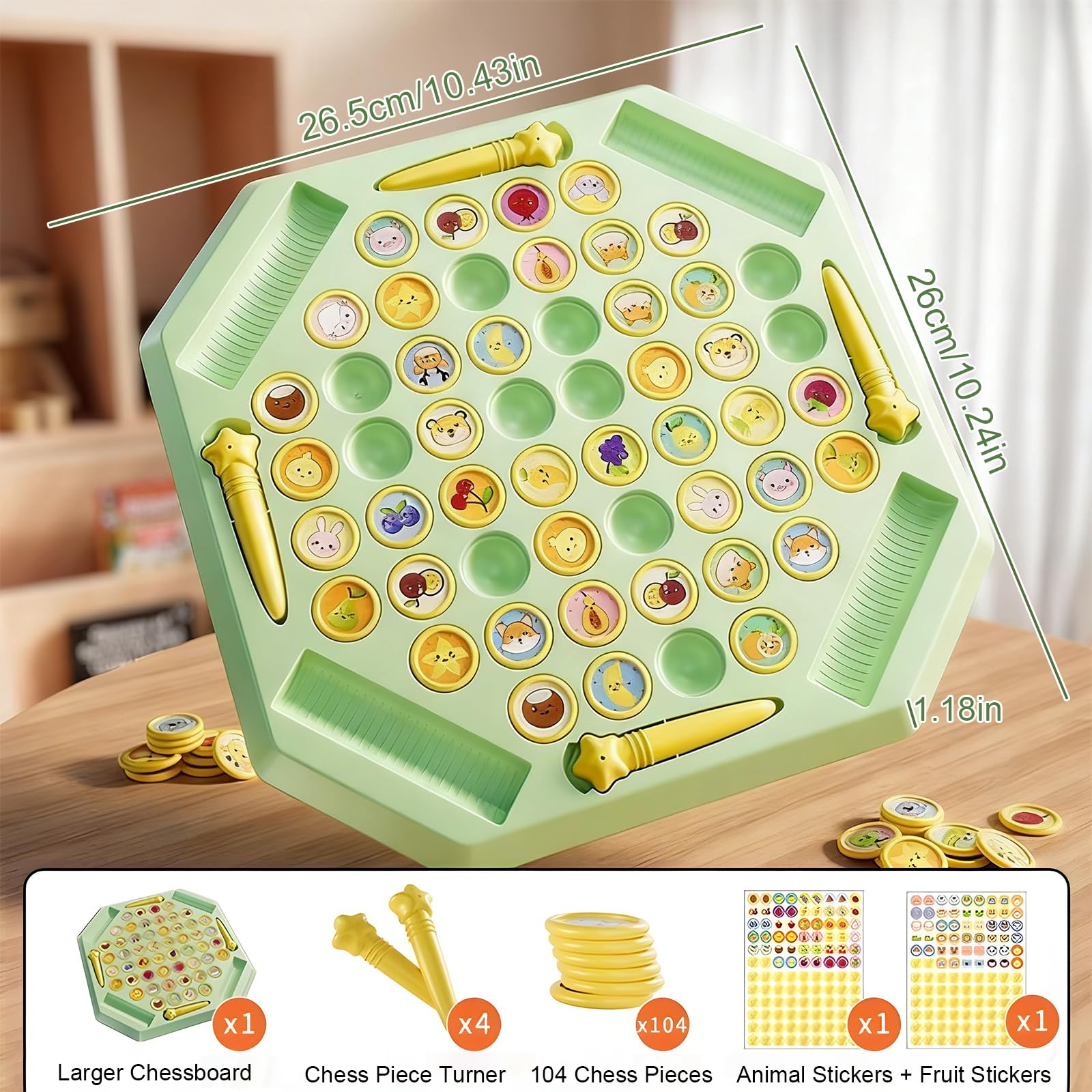 - Package Includes : Memory Flip Chess game includes a set of chess pieces with animal and fruit themes, including 1 x enlarged chessboard+4 x flip pens+104 x chess pieces+1 x animal stickers+1 x fruit stickers. You can stick stickers on each toy, and children can learn about different animals and fruits through play and have fun learning.