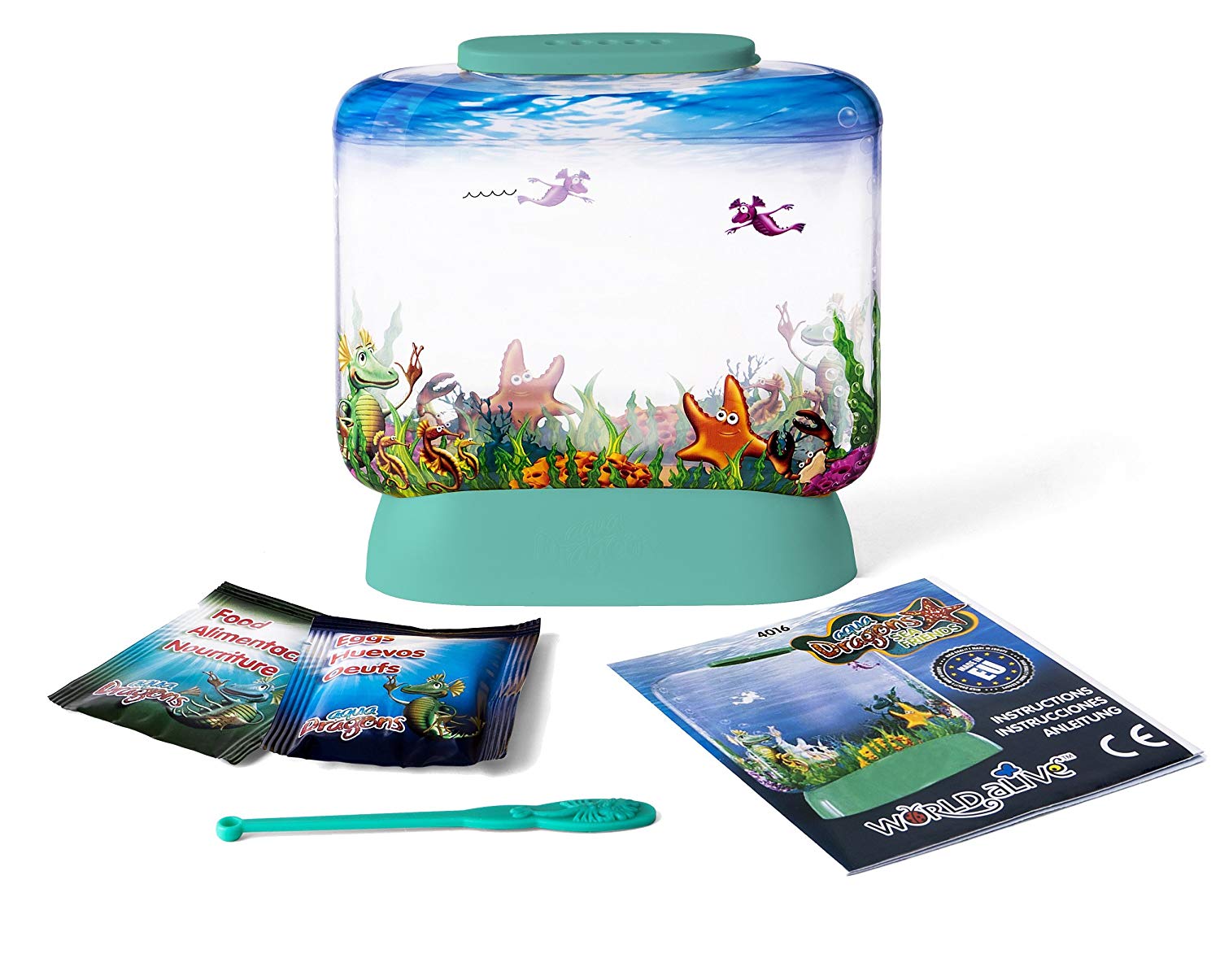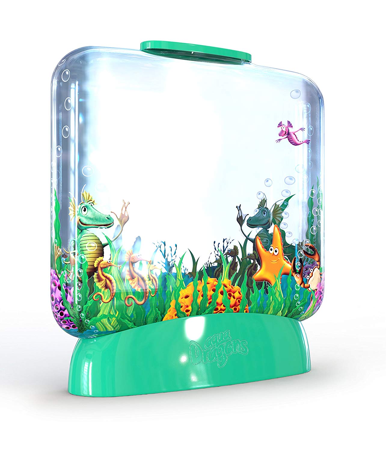 Aqua Dragons are real live aquatic creatures that you can hatch and grow at home. Their scientific name is Artemia Salinas, and they have been living in the sea and salty lakes for millions of years; right back to the time when dinosaurs roamed the Earth! From the crustacean family, Aqua Dragons look like tiny three eyed, long tailed, hairy headed dragons that grow up to 2cm long. Their eggs have an amazing capacity called cryptobiosis which means they can dry out and stay alive only to hatch many years later. Tests have found that eggs kept in air sealed containers for up to 20 years still hatched when they were returned to water. The Aqua Dragons line of products enables children and animal lovers of all ages to hatch and grow a generation of these amazing creatures at home. Backer carded kit with a fully decorated tank, eggs, food and spoon. Also includes invite to download the free Aqua Dragons Investigator App.