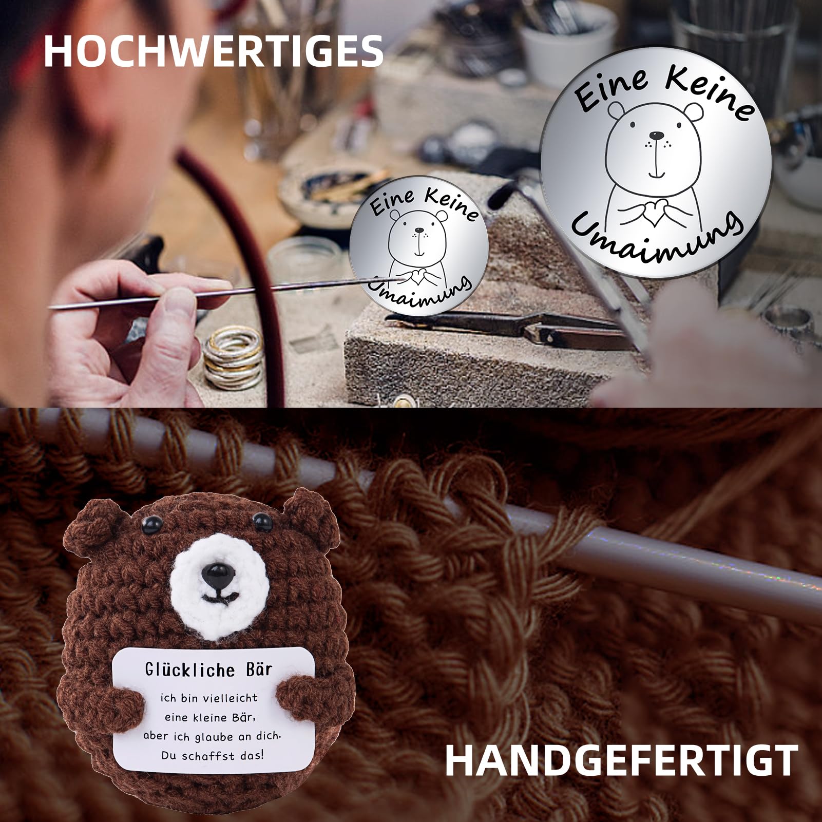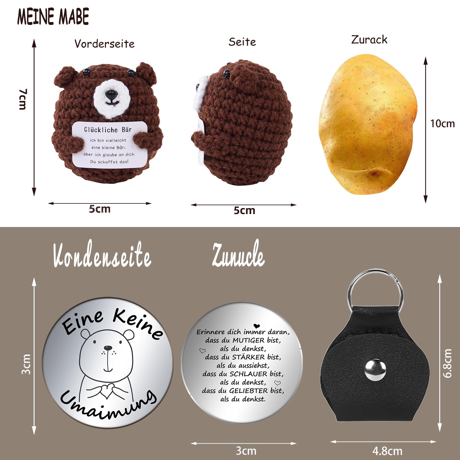 PURE HAND WOVEN The bear doll is hand-stitched and knitted with wool and cotton knitted, and decorated with a mini card with positive words. Soft and comfortable, delicate, excellent elasticity, no deformation, it does not fade when compressed. And the lucky charm is made of stainless steel, is clearly engraved with potato patterns and encouraging words.