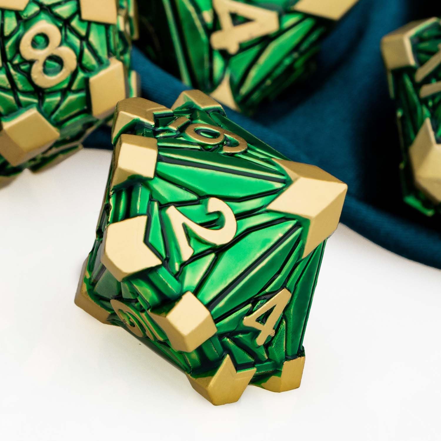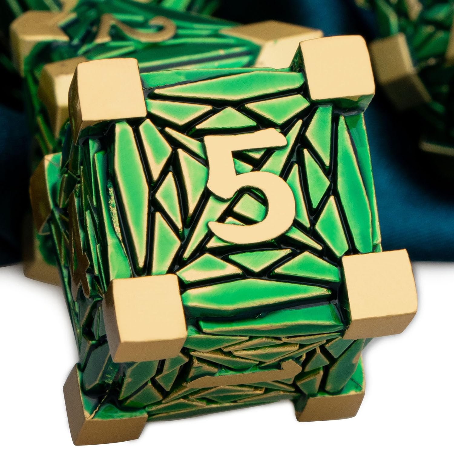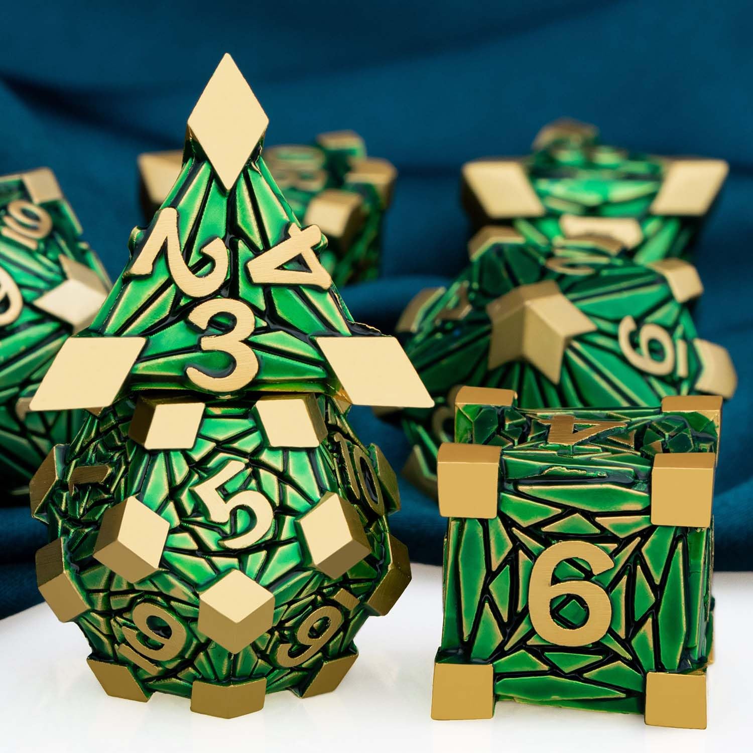 ARUOHHA DND Metal Dice Set Crystal Shards Dice with Gift Box, 7PCS Golden Green Polyhedral Dragons Dice RPG Role Playing Game Handmade 6 Sided Dungeons D and D Dice Set D20 D12 D10 D8 D6 D4