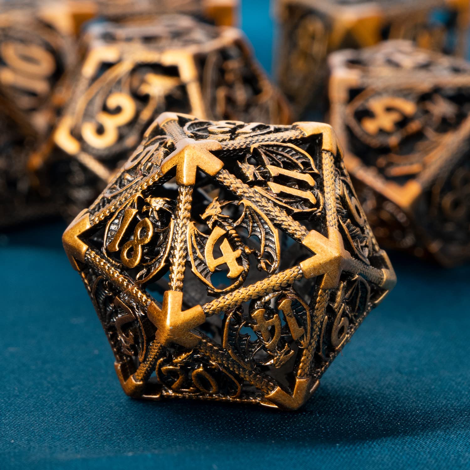 ARUOHHA Hollow DND Dice Set 7PCS Antique Gold Metal Dragons Dice with Gift Box, D and D Dice RPG Role Playing Games Dungeons Polyhedral Dice Set D20 D12 D10 D8 D6 D4