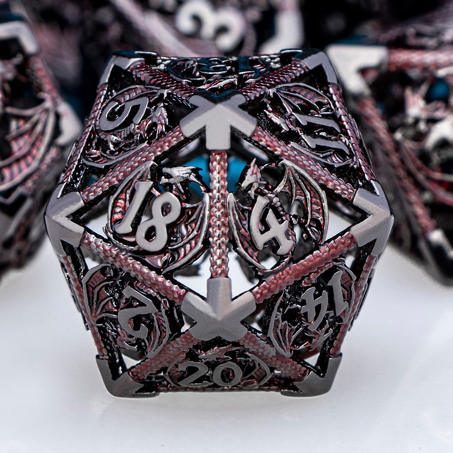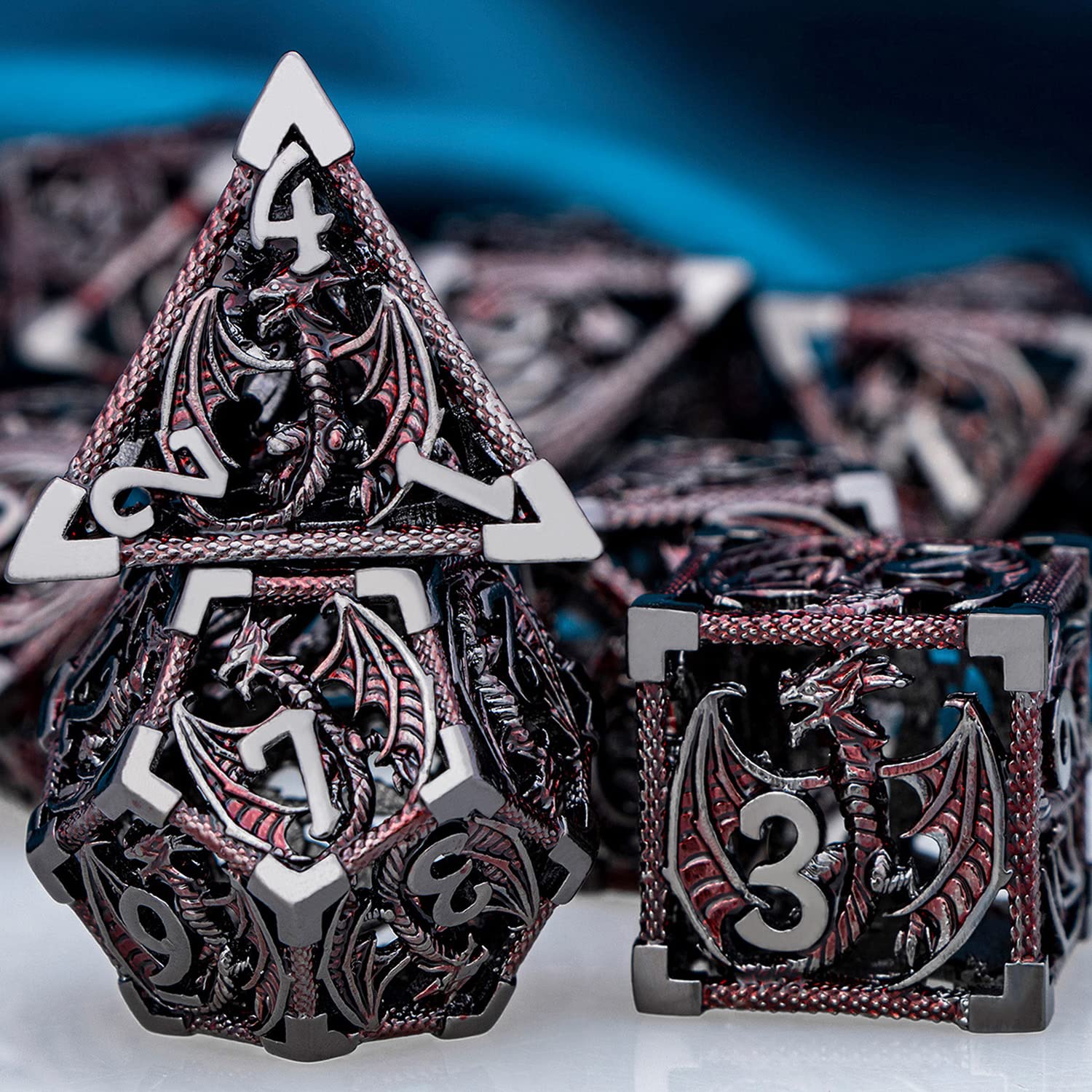 - Hollow DND Dice: The RPG dice set use dragon as the main element. The numbers on the dice are clear and easy to read, They are perfect in detail and well crafted. When they are placed on the table, they will get a lot of compliments and envy