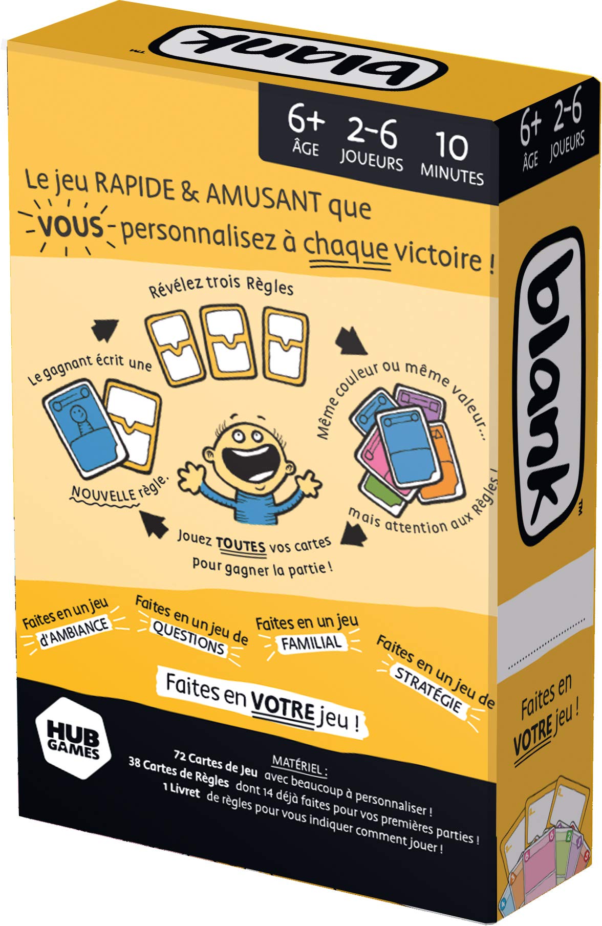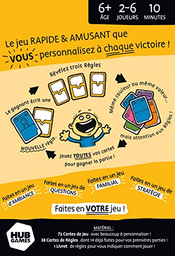 Contains 38 ruler cards (14 basic rules, 24 blank cards to create), 72 game cards (6 illustrated with effects, 30 illustrated to personalize, 36 blank cards).
