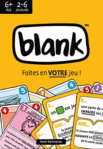 Customise your game! It’s all about BLANK, the fun and interactive card game. From the end of the first game, your copy of BLANK is unique, as you will create cards. The principle is simple: get rid of all your cards. To do this, you need to place one or more cards on the stack with the colour or number correspond to that of the top of the pack. When a rule card appears, you must bend to this new ruler under penalty. In addition to having a crushing victory, the winner can create their own card to add to the next part. A guide is provided to guide the first creations… After that, we rely on you to get imagination! You have 30 illustrated cards to personalise and 60 perfectly blank cards for your creativity. A game that will not stay white for a long time.