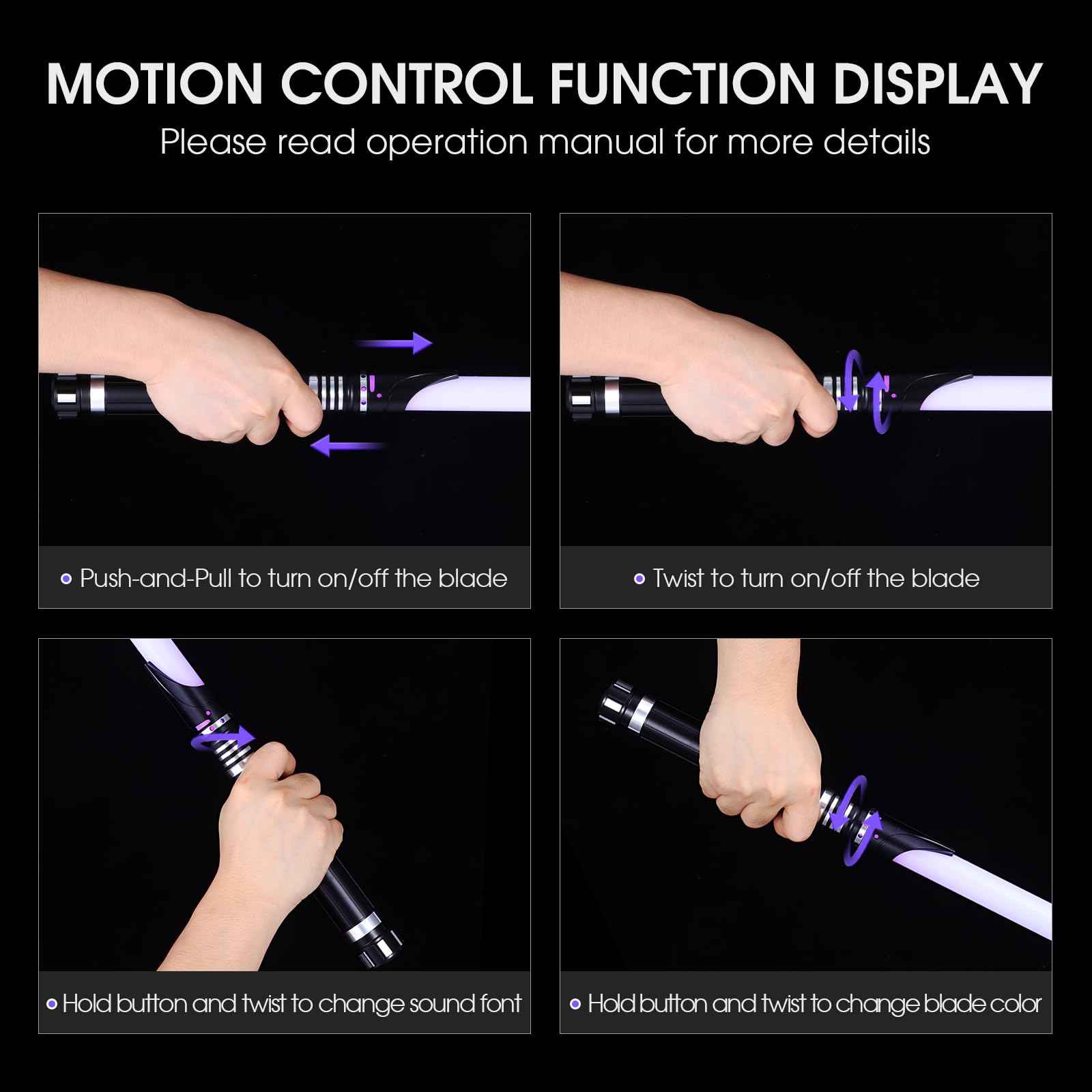 - New Motion Control FunctionsThis dueling saber is a high-level smart light saber with 2 kinds of motion control, including twist and stab-and-pull. The motion control function could be turned off if you prefer the button control. With the motion control function, you can turn on/off the blade lighting, switch among the sound fonts, switch among the colors of the blade lighting, switch among the background music, and switch among the 4 blade effects.
