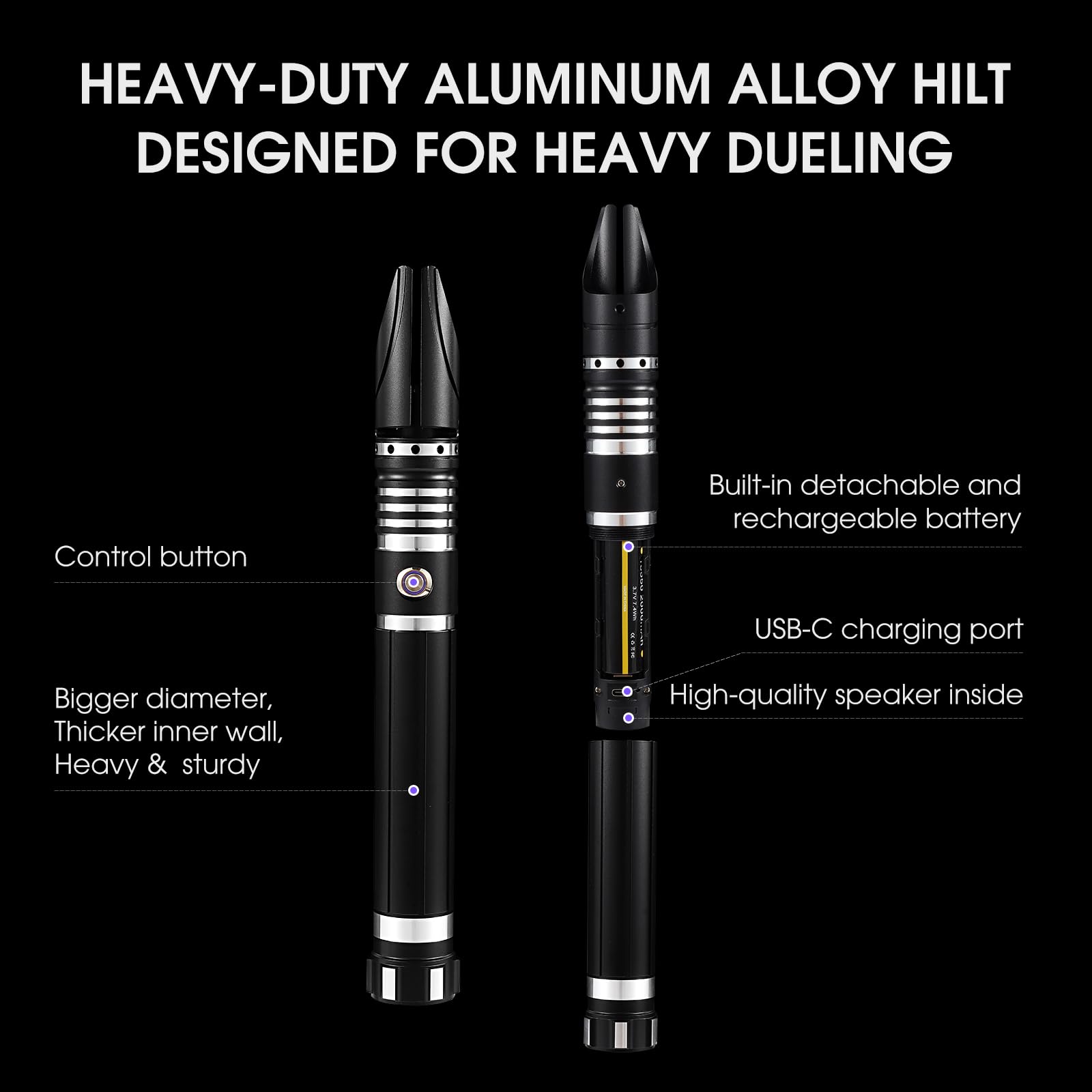 - Sturdy Aluminum Hilt & Thick PC BladeThis lightsaber for dueling comes with a heavy-duty hilt made of metal aluminum and weighs around 360g, heavier and sturdier than most lightsabers. This RGB lightsaber is equipped with an 82cm/32in, high-impact, and thick blade made of polycarbonate, making it resistant to blows, hard to bend or break, and ideal for real heavy dueling.