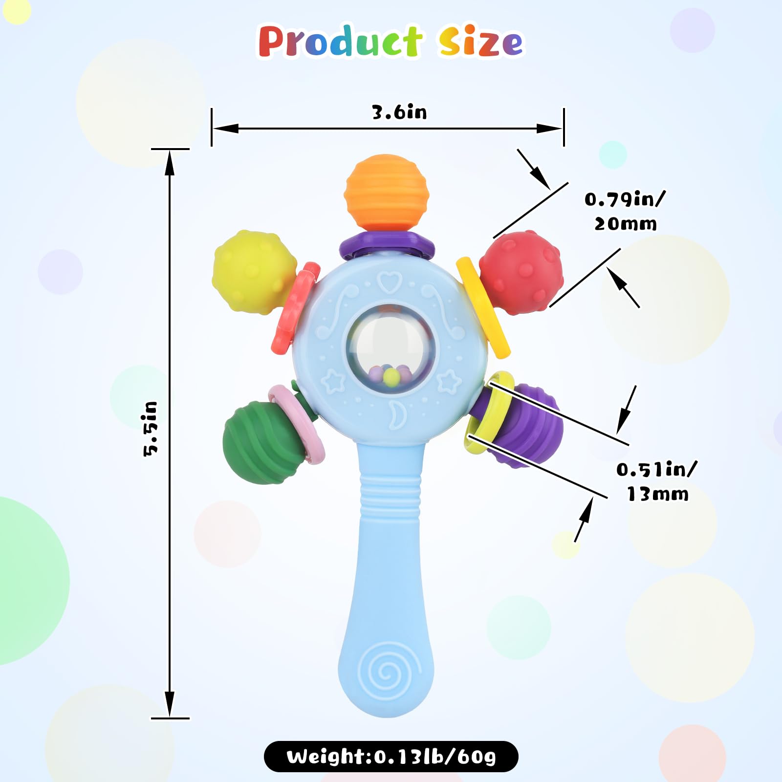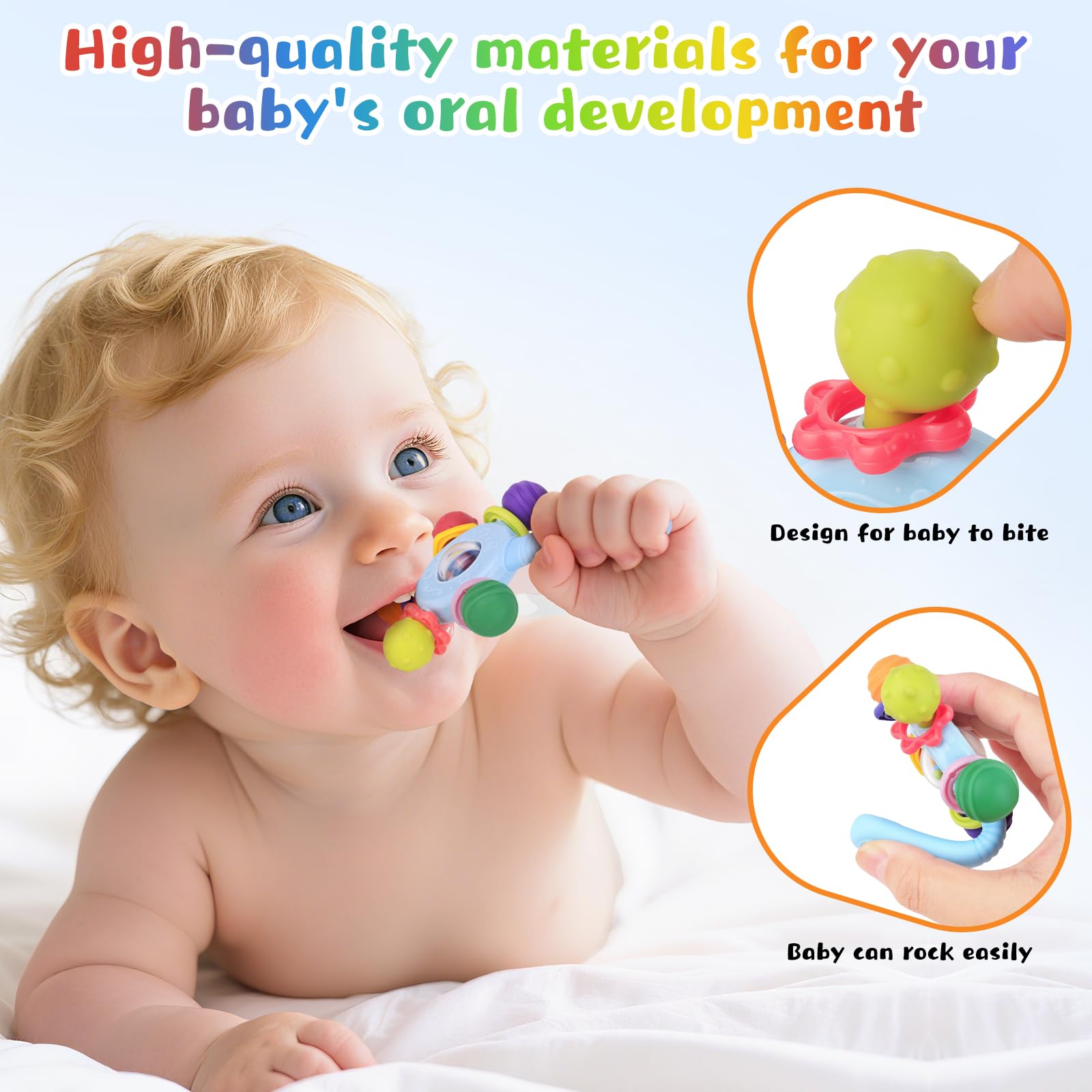 MULTIFUNCTIONAL TEETHING TOYS:Baby Rattle Silicone Teether, Sensory Toys for 0 Months+, Combines Multiple Play Functions. In addition to its role in soothing teething and promoting sensory development, the baby teething ring can also be used as a rattle and grasping toy. Its multi-functional use keeps your baby entertained and supports their overall development through play.