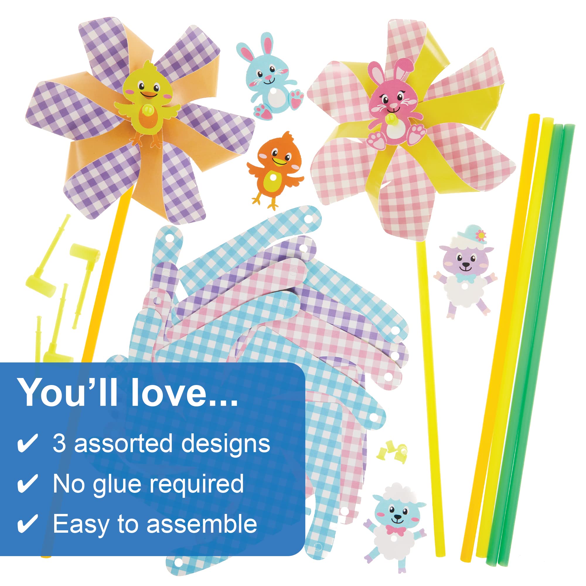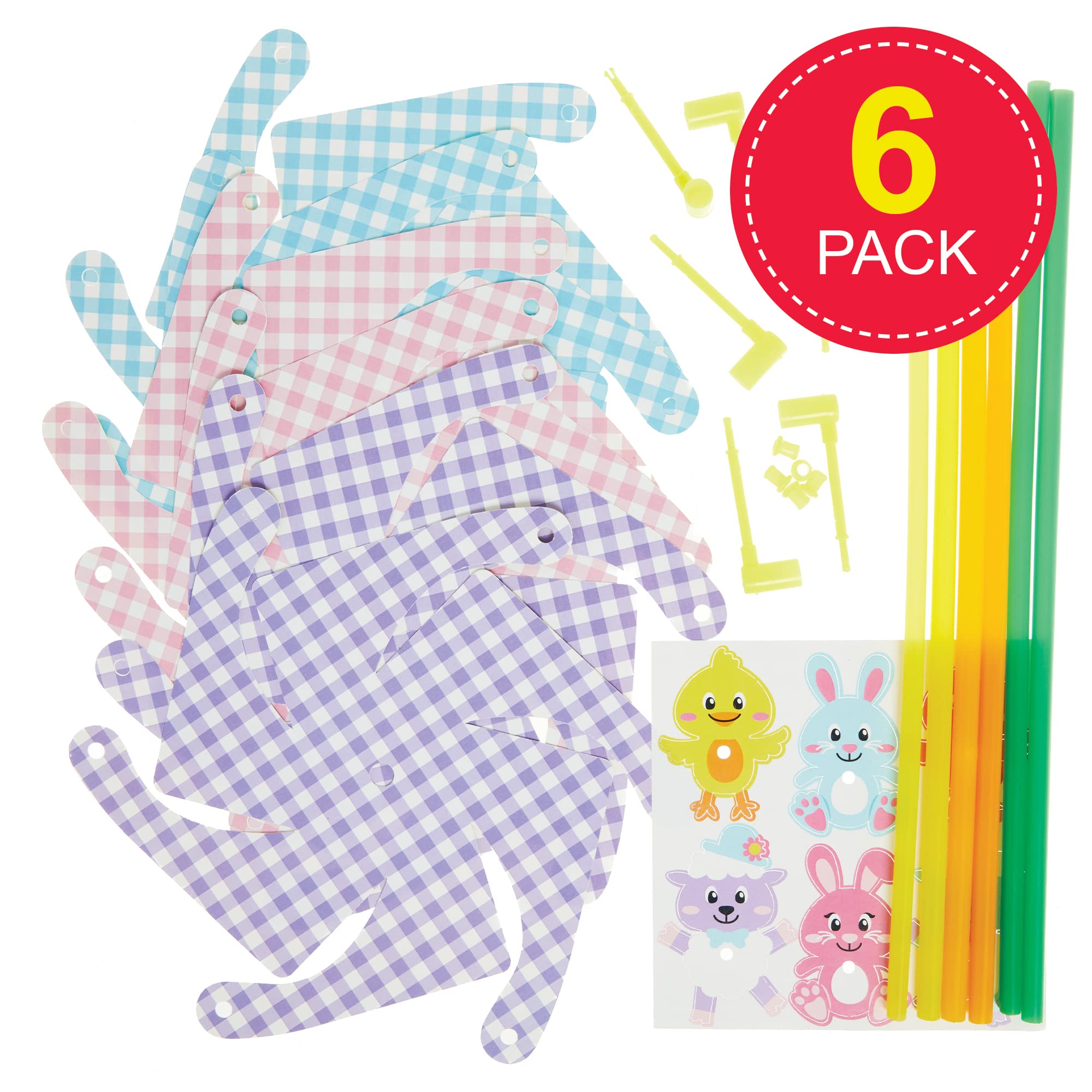 - Included in the Pack: This pack contains 6 kits, in 3 assorted designs – lamb, chick and bunny. Each kit includes pre-cut card shapes and decorations, windmill stick and plastic connector. Size 24cm. Instructions included. No glue required. For ages 5+