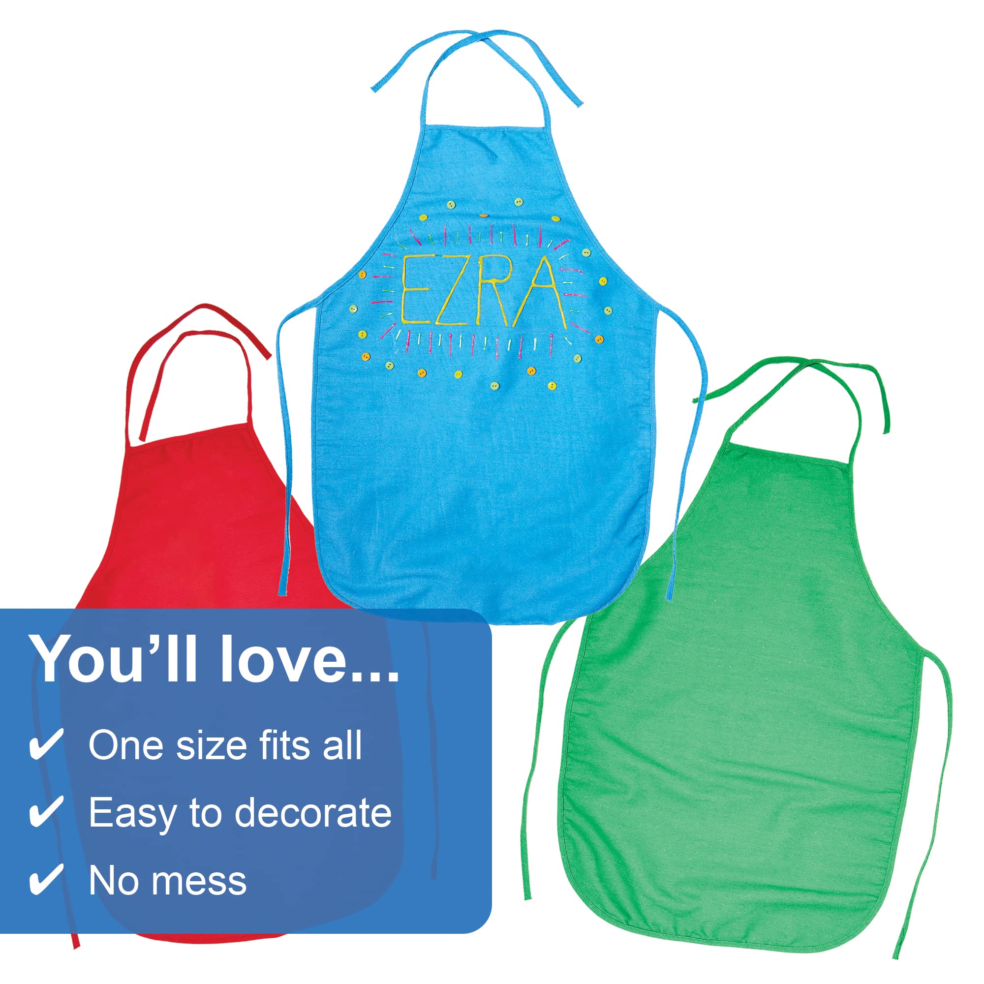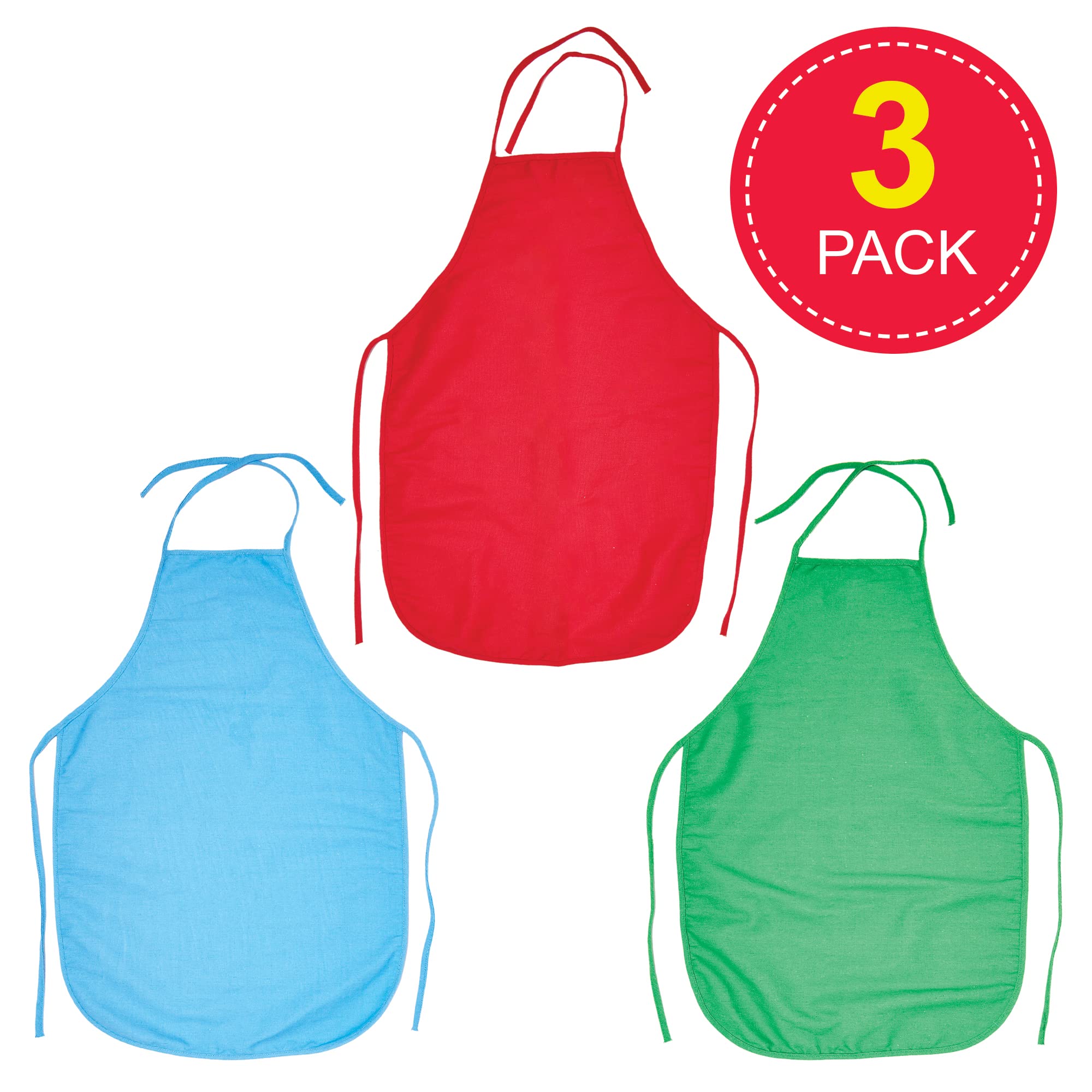 - Included in the Pack: This pack contains 3 aprons, in 3 assorted colours – red, green and blue. Apron length 71cm. For age 4+