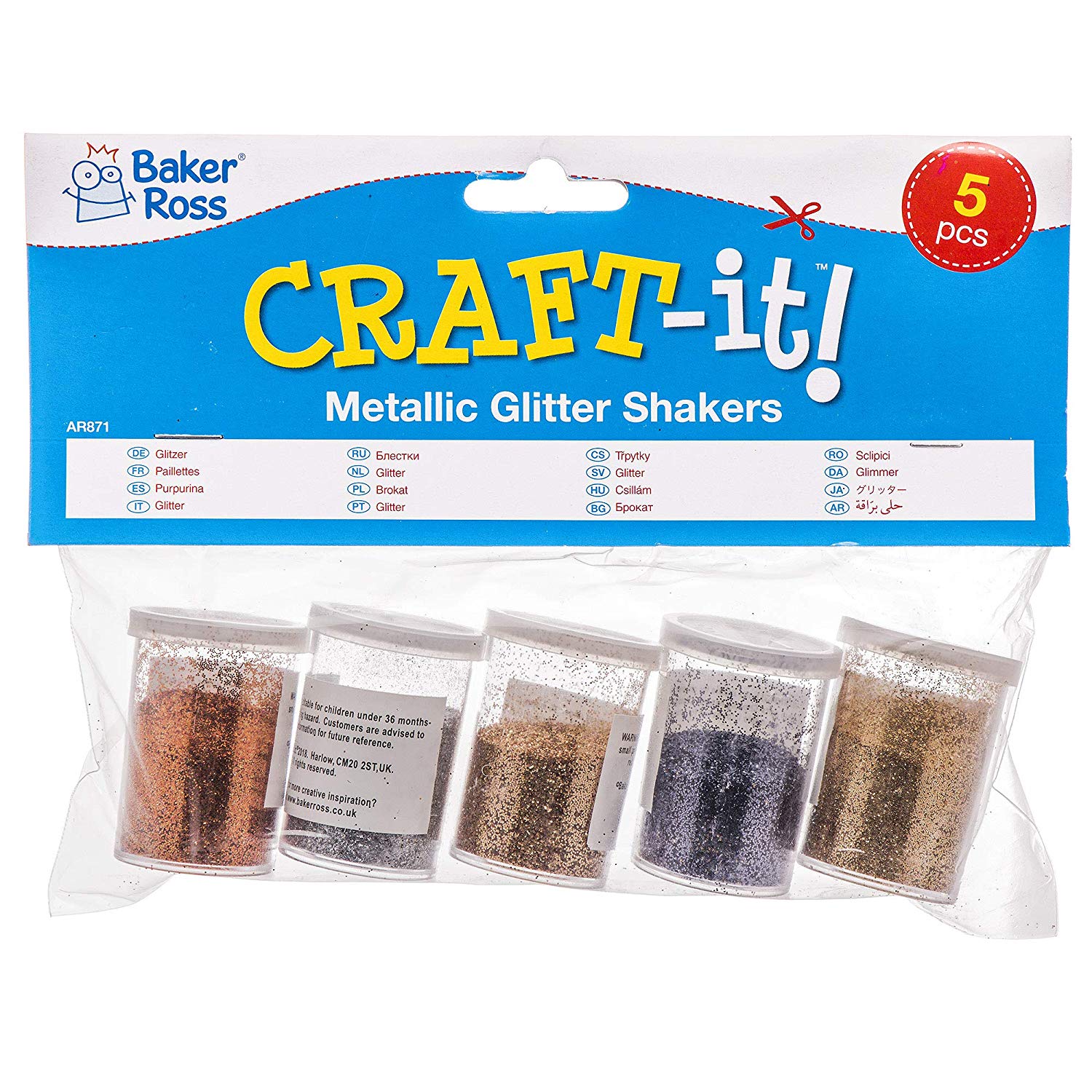 Baker Ross AR871 Metallic Glitter Shakers for Kids Arts and Crafts — Glitter Containers Ideal for Crafting in Classrooms, Schools, and Preschools (Pack of 5)