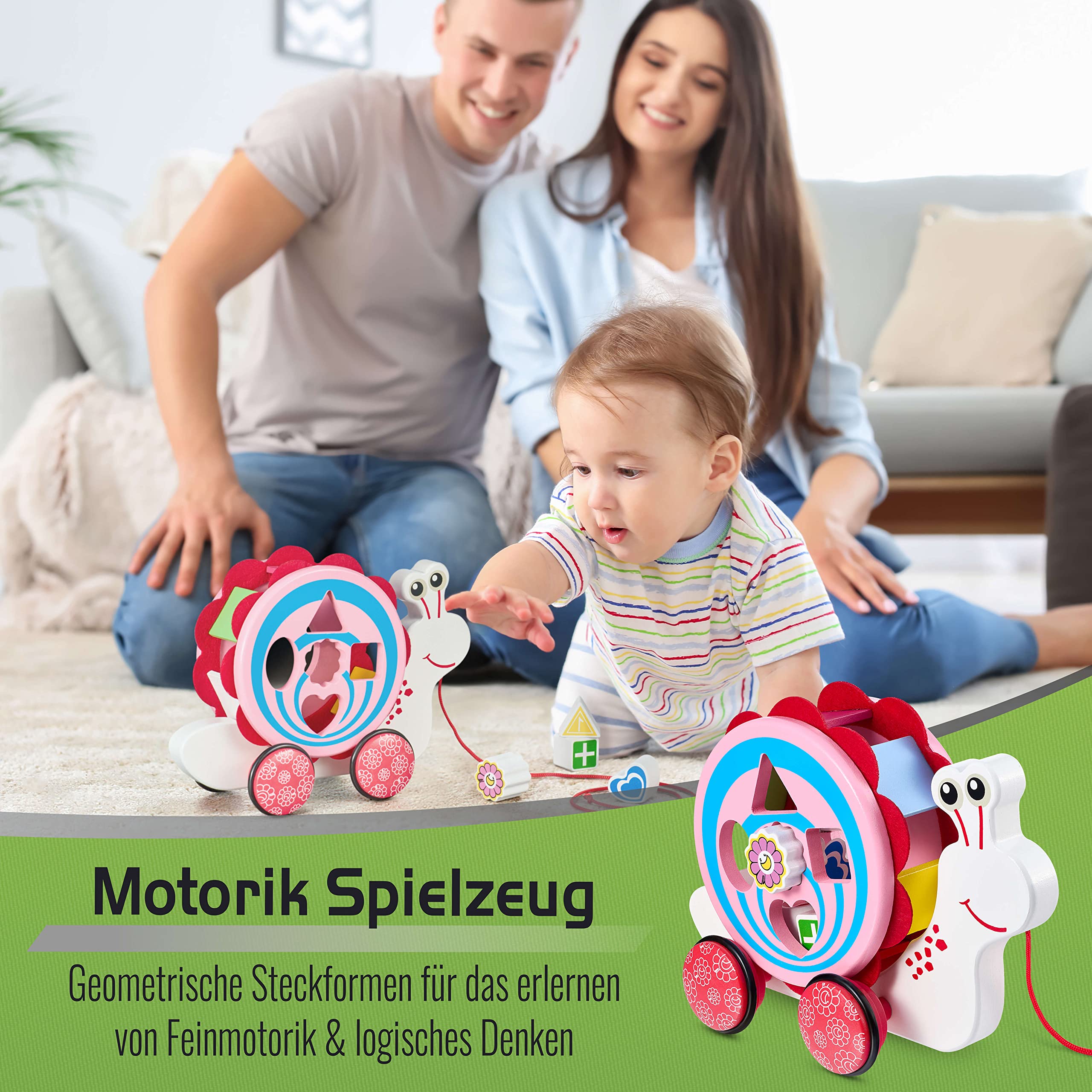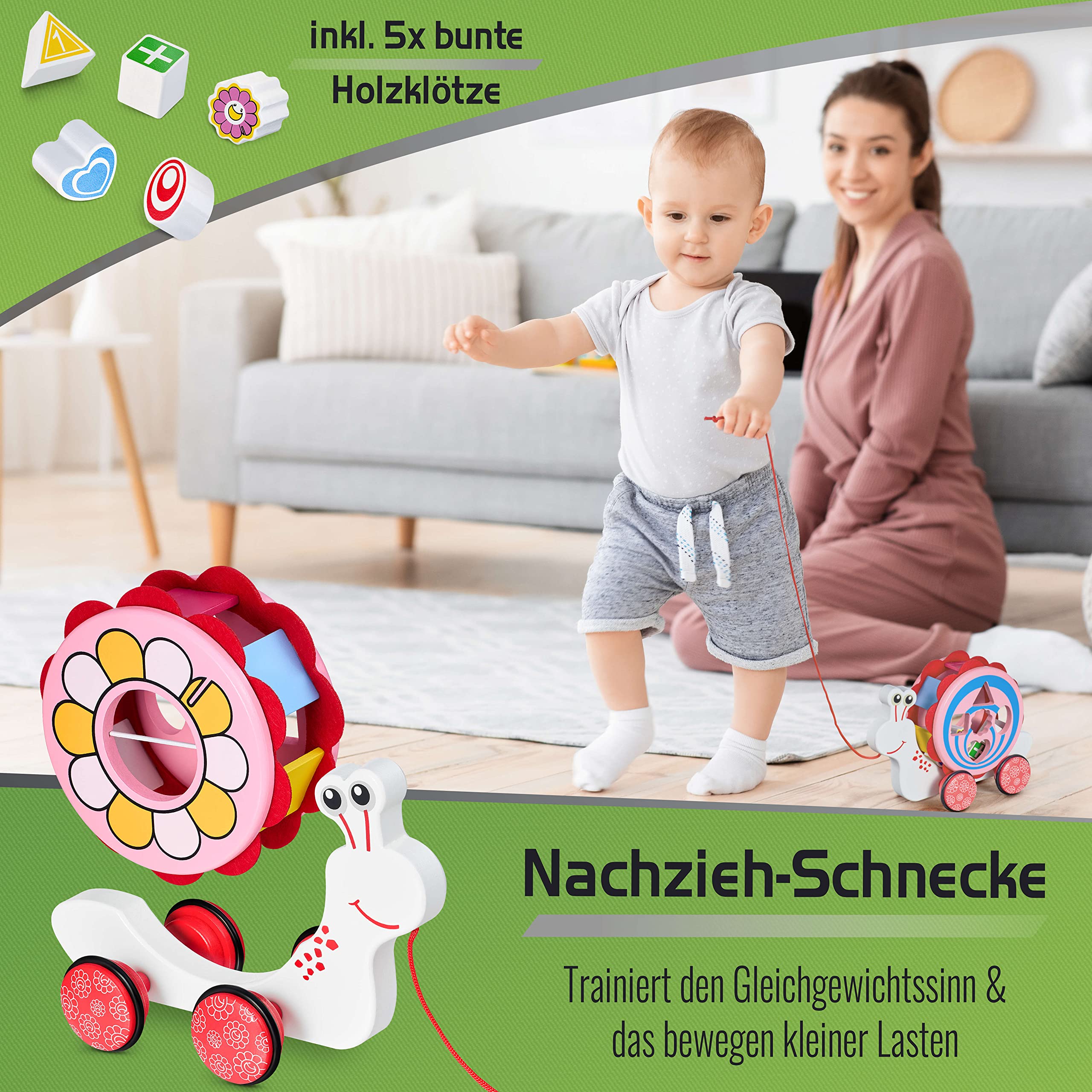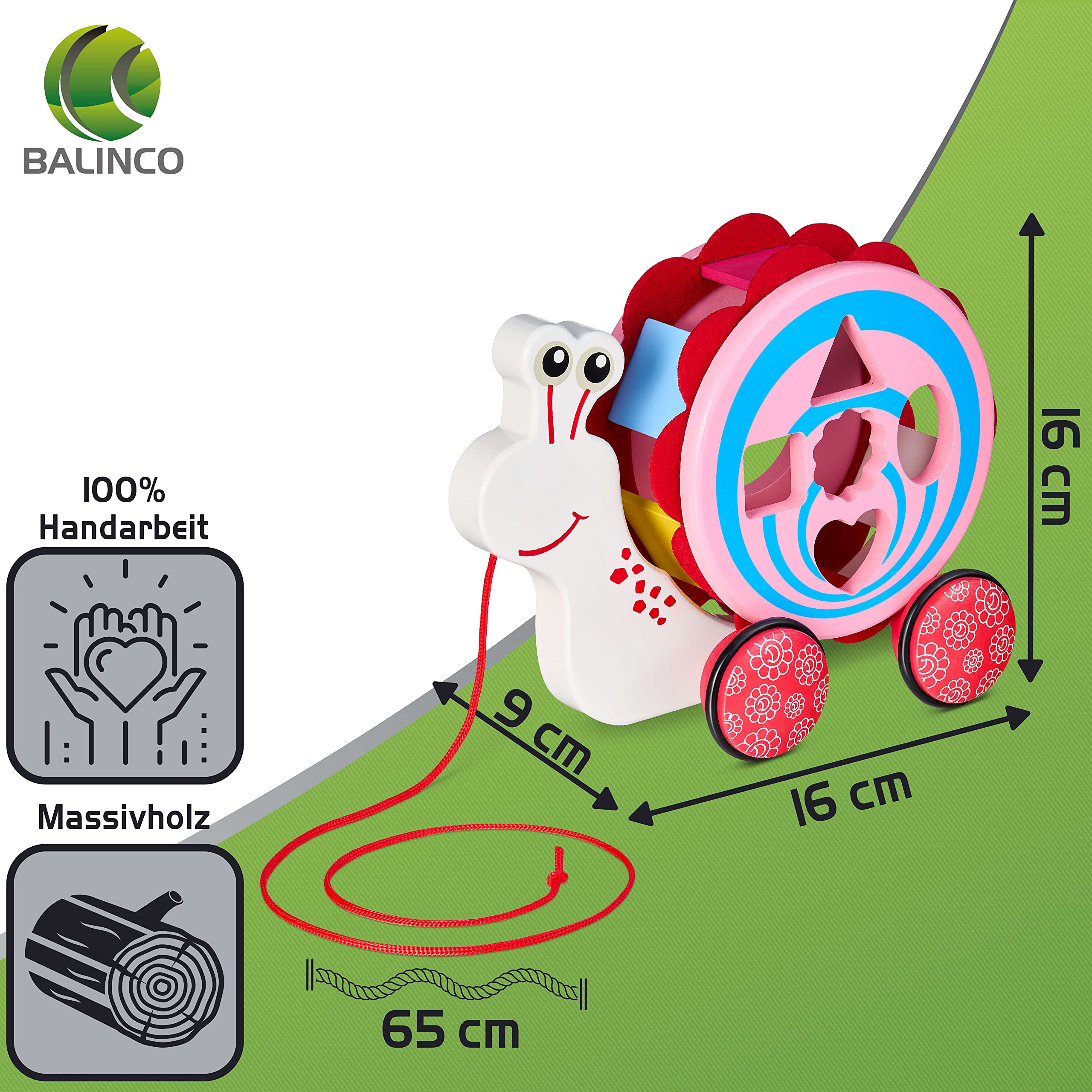 - 2 in 1 advantage: The Balinco snail is not only a pull-along toy. The snail’s shell has 5 geometric shapes including blocks, making it a motor skill toy as well.