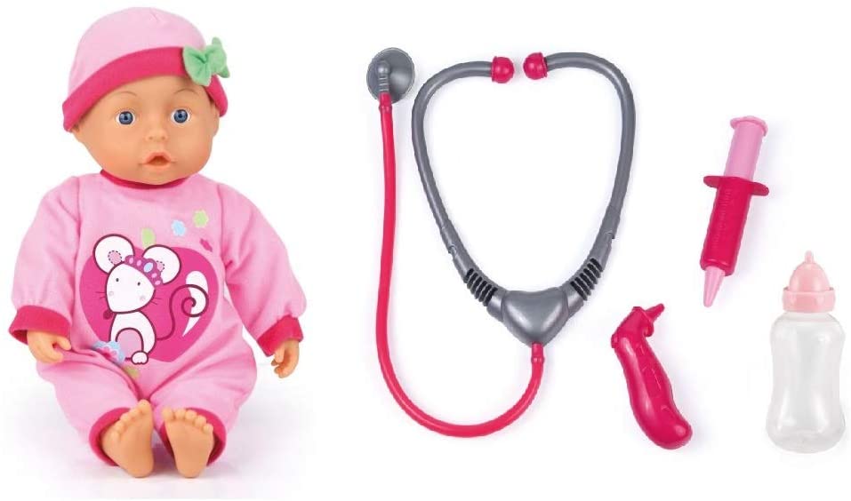 This baby doll set is great for little girls age 3 years and over. The doll measures approx 33cm and features 24 sayings. The doll comes with accessories including a syringe, bottle and stethoscope. Sutiable for ages 3 years and over.