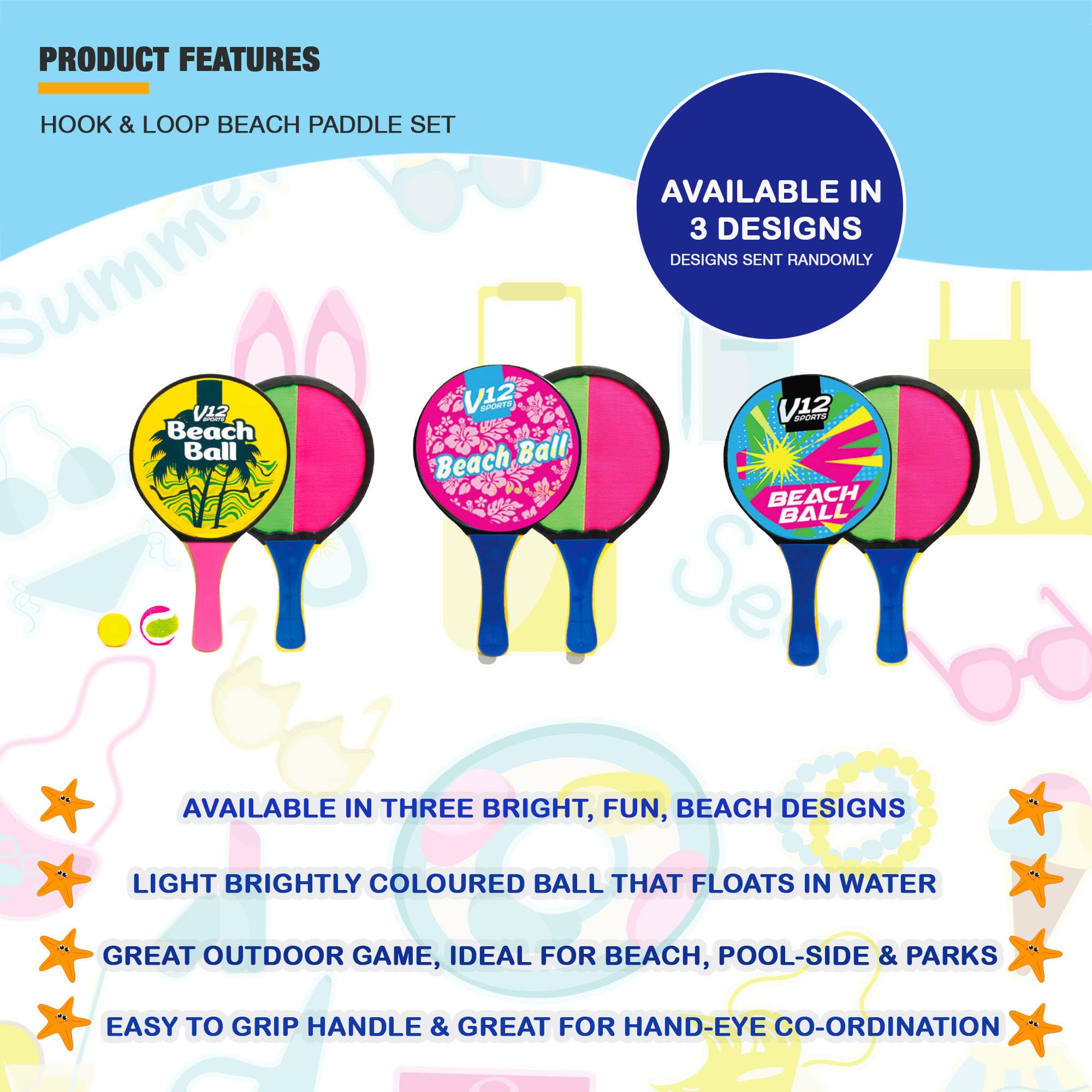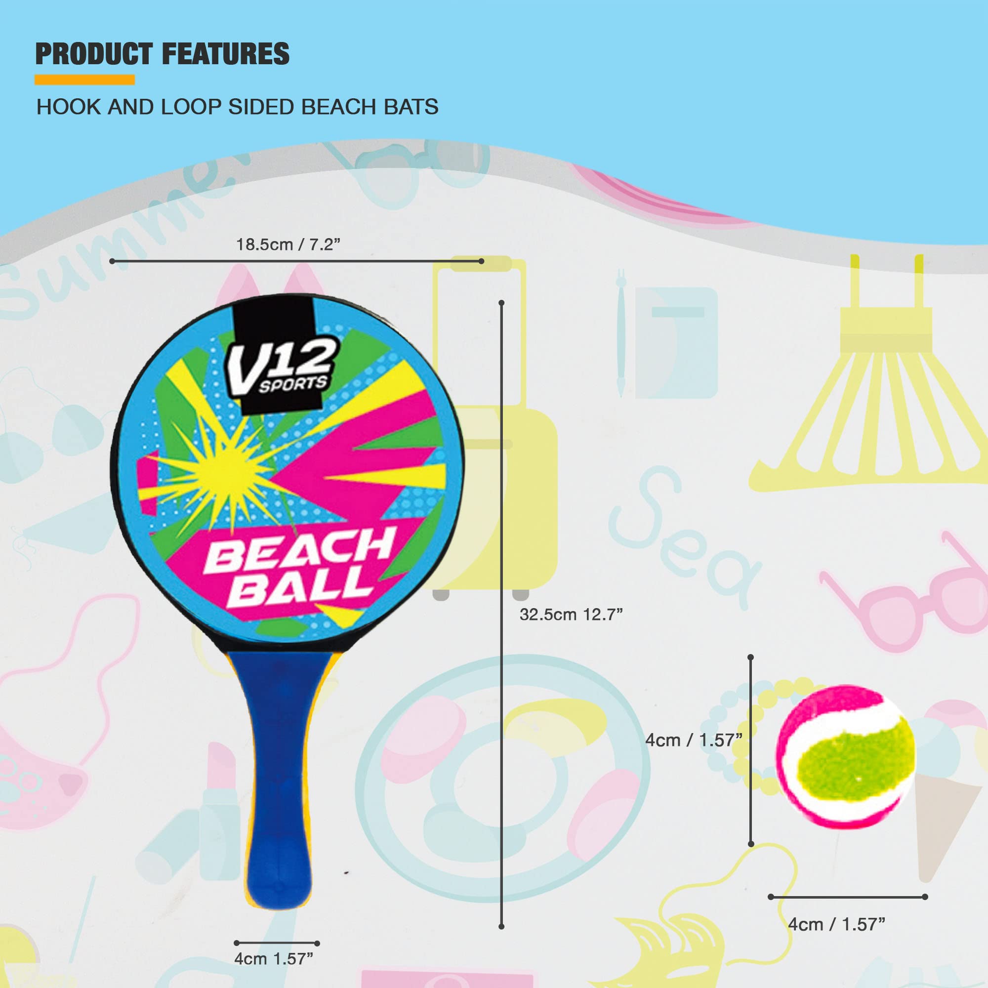 THIS PACKAGE INCLUDES – 2x Beach Bats (randomly sent design) 18.5cm / 7.2 X 32.5cm / 12.7, 1 x Lightweight Ball, 1 small hook & loop tennis ball