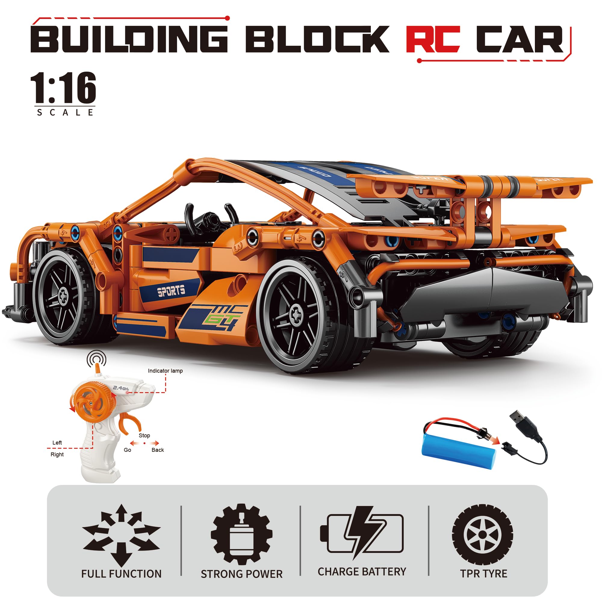 belodoro Building Blocks RC Super Car with LED Lights, Remote Control 1:16 Speed Car, Toys Vehicle, Construction Toys, Gift for Boys and Girls Over 6 Years Old, Present for Kids Age 6+, 70010D