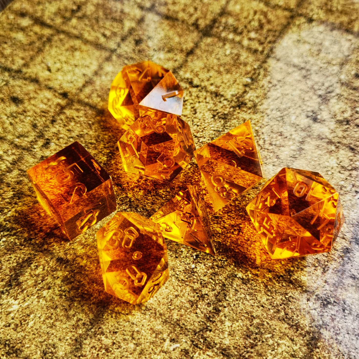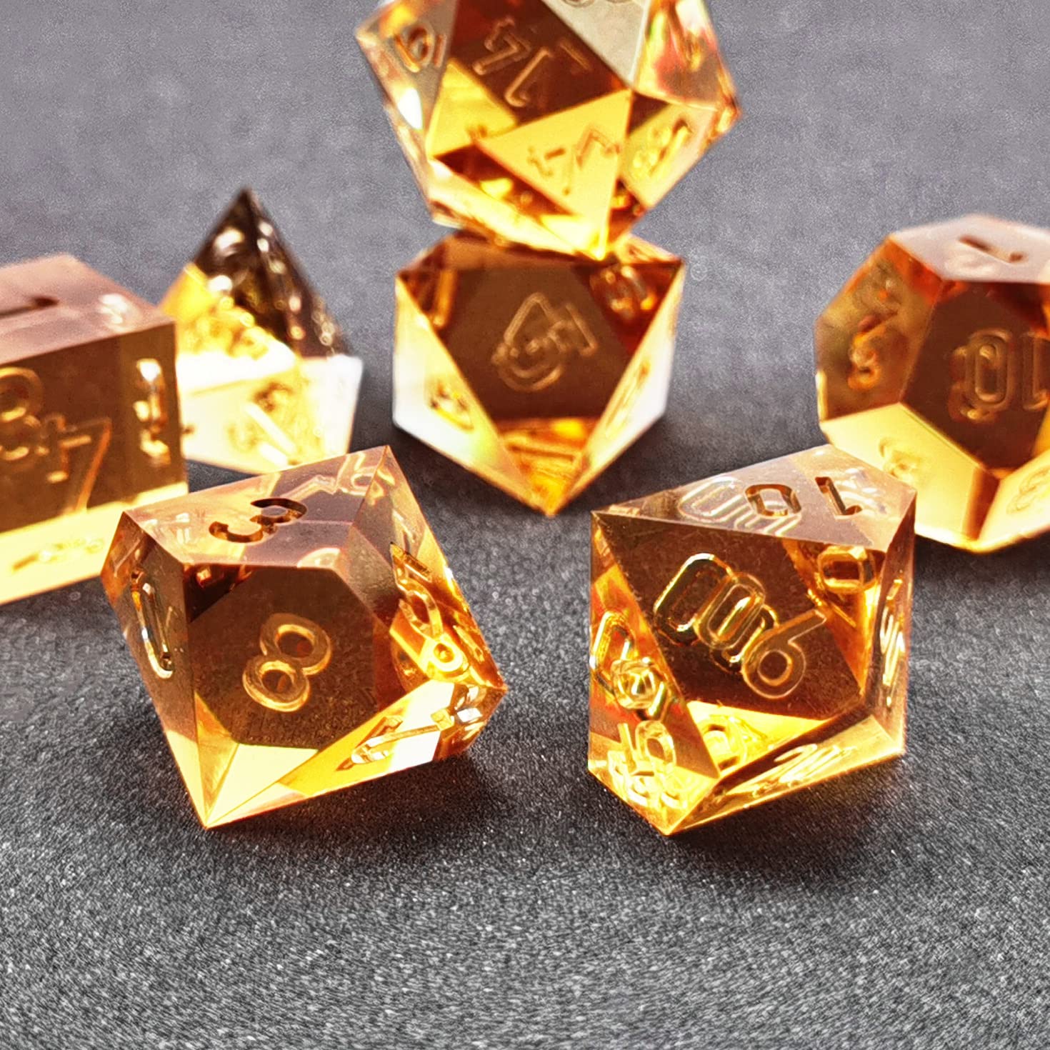 Bescon Crystal Clear (Unpainted) Sharp Edge DND Dice Set of 7, Razor Edged Polyhedral D&D Dice Set for Dungeons and Dragons Role Playing Games, Amber Color