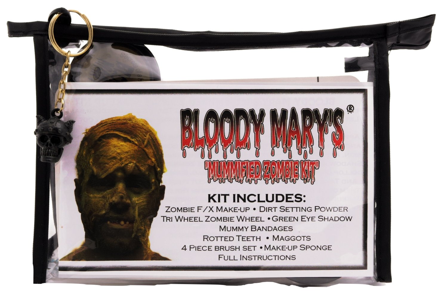 A new twist on the Old Zombie. The Kit includes Zombie Tri Color Wheel of Foundations, Mummy Dirt Setting Powder, Zombie F/X makeup, Mummy Green Eye Shadow, Mummy Bandages, Rotted Teeth, Maggots, 4 Piece Brush Kit, Makeup Sponge and Full Instructions. Comes in a clear zippered Makeup Case with a Skull Key Chain. Everything you need to create this horrific character. Perfect Halloween makeup kit or Face Paint kit. Great addition to Halloween costume.