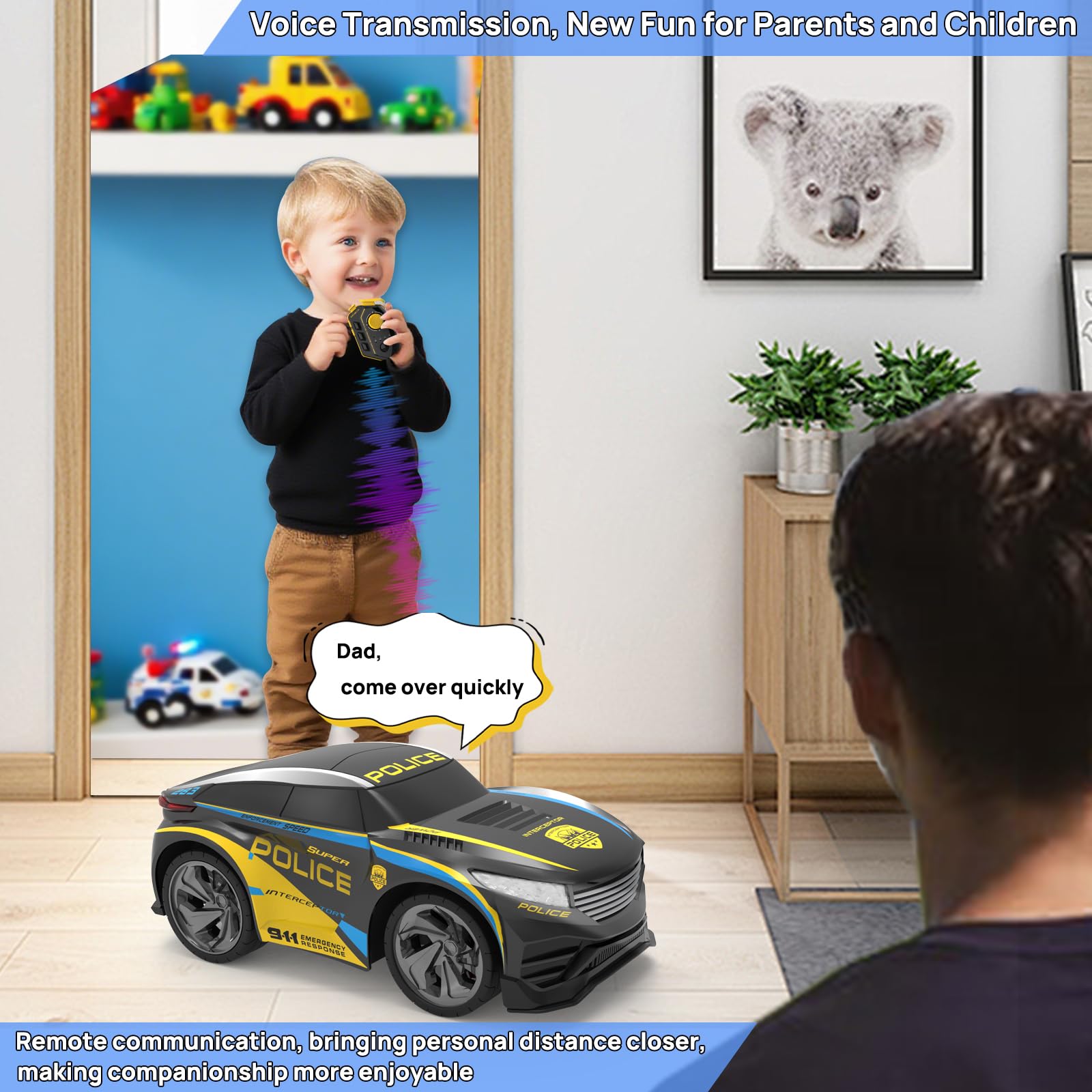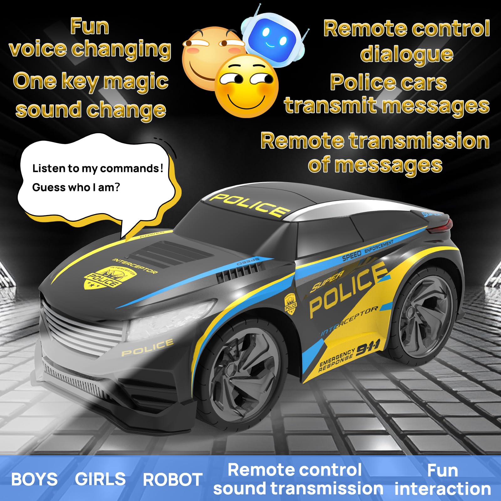 - Funny RC Car with Voice Changing & Recording: Unlike regular remote control cars, this rc police car lets kids talk in real-time, record messages, and play them back! Choose from four fun voice changing modes (original voice, boy voice, girl voice, and robot voice) for an interactive and engaging police playing experience.