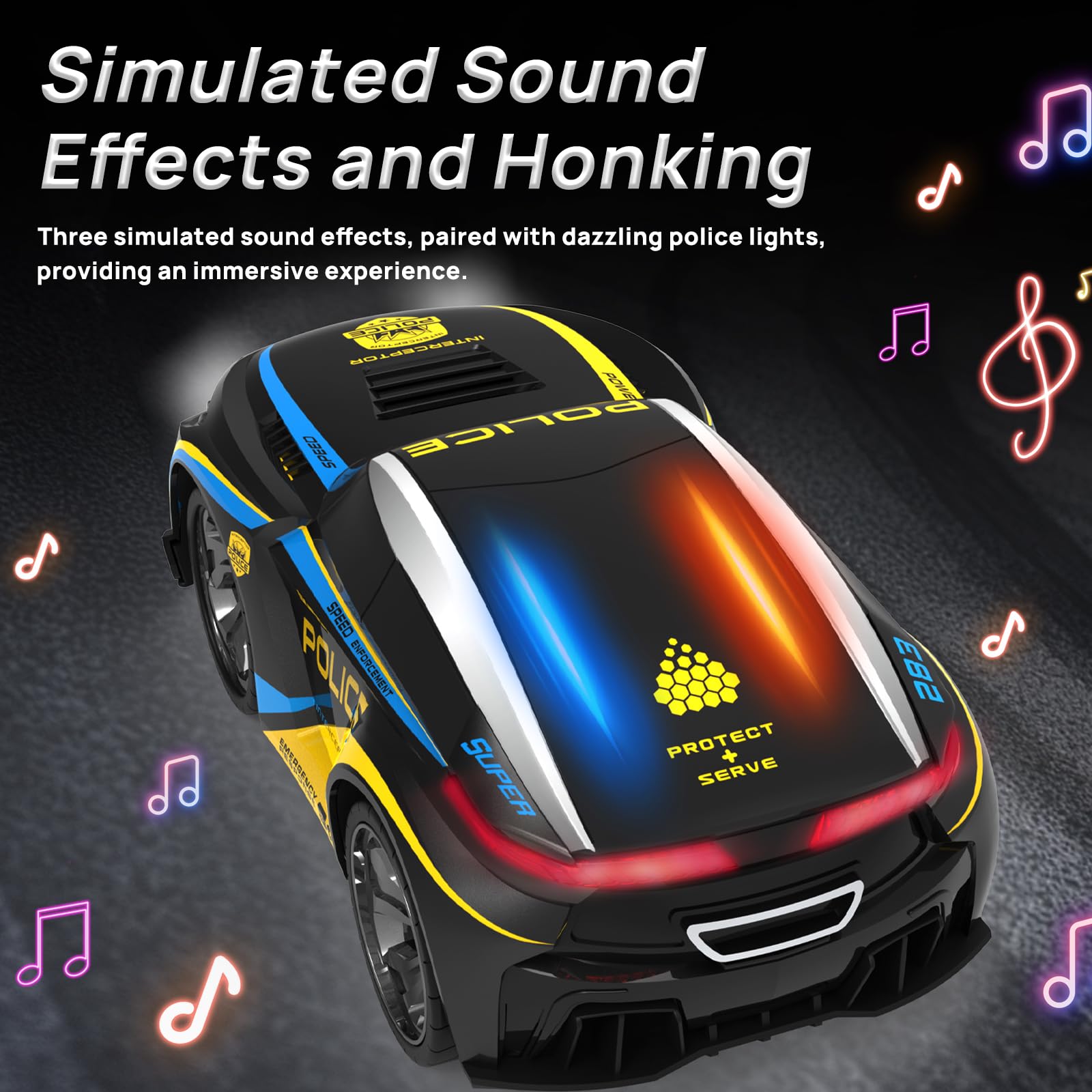 - Flashing Police Lights & Realistic Siren Sounds: This police car toy with lights and sounds features three different police sirens, horn sounds, and flashing LED lights to create a thrilling chase scene. A perfect gift for kids who love rc car police toys!