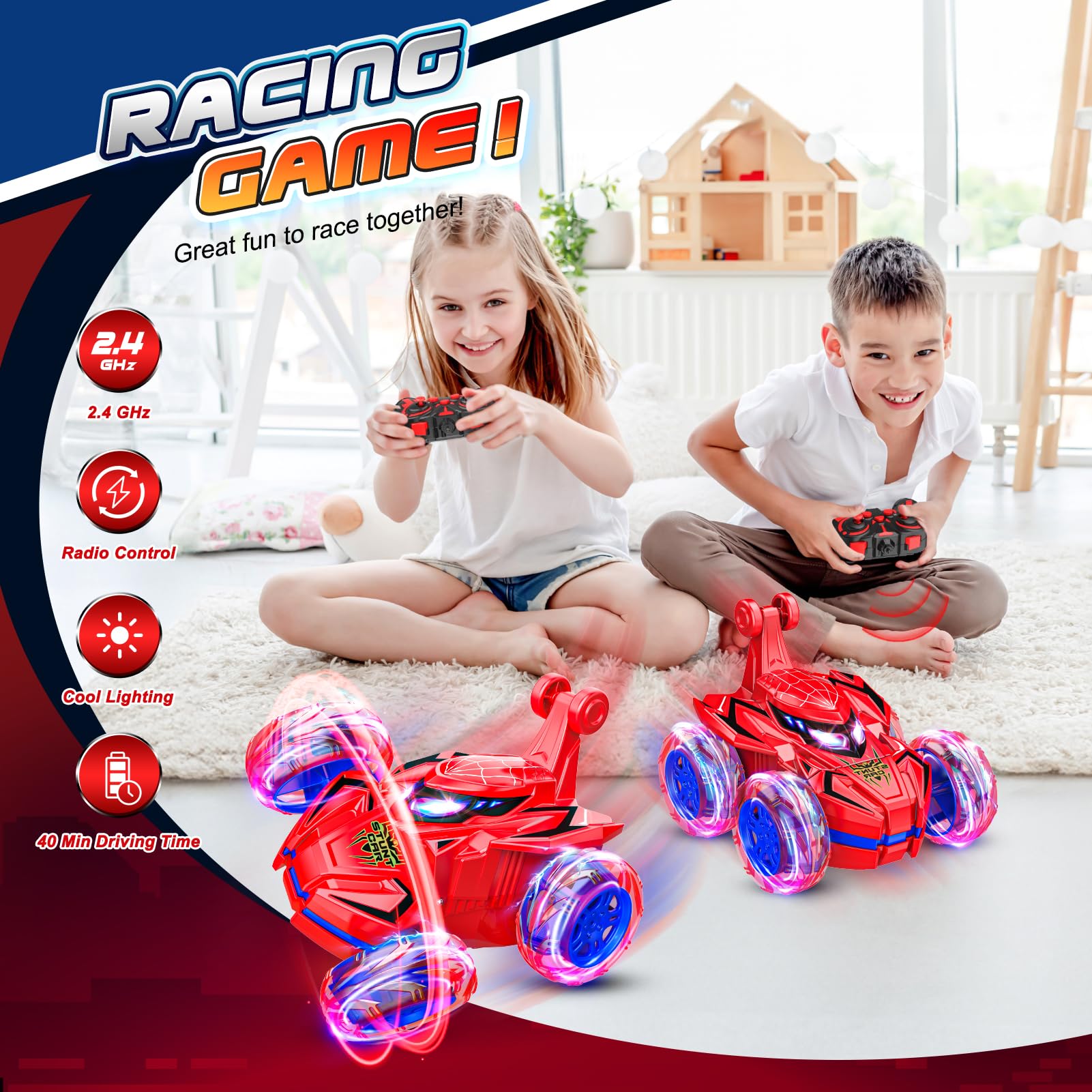 • Awesome StuntsEffortlessly perform 360 flips, lighting body and wheels, and even drive 90 upright drivingthe ultimate cool factor! Boys will be captivated by the variety of game-play options for endless fun. Powered by 2.4GHz remote technology, this boys toys age 3-9 can reach speeds up to 15 km/h, allowing multiple drivers to race simultaneously without signal interference within a 60-foot radius.