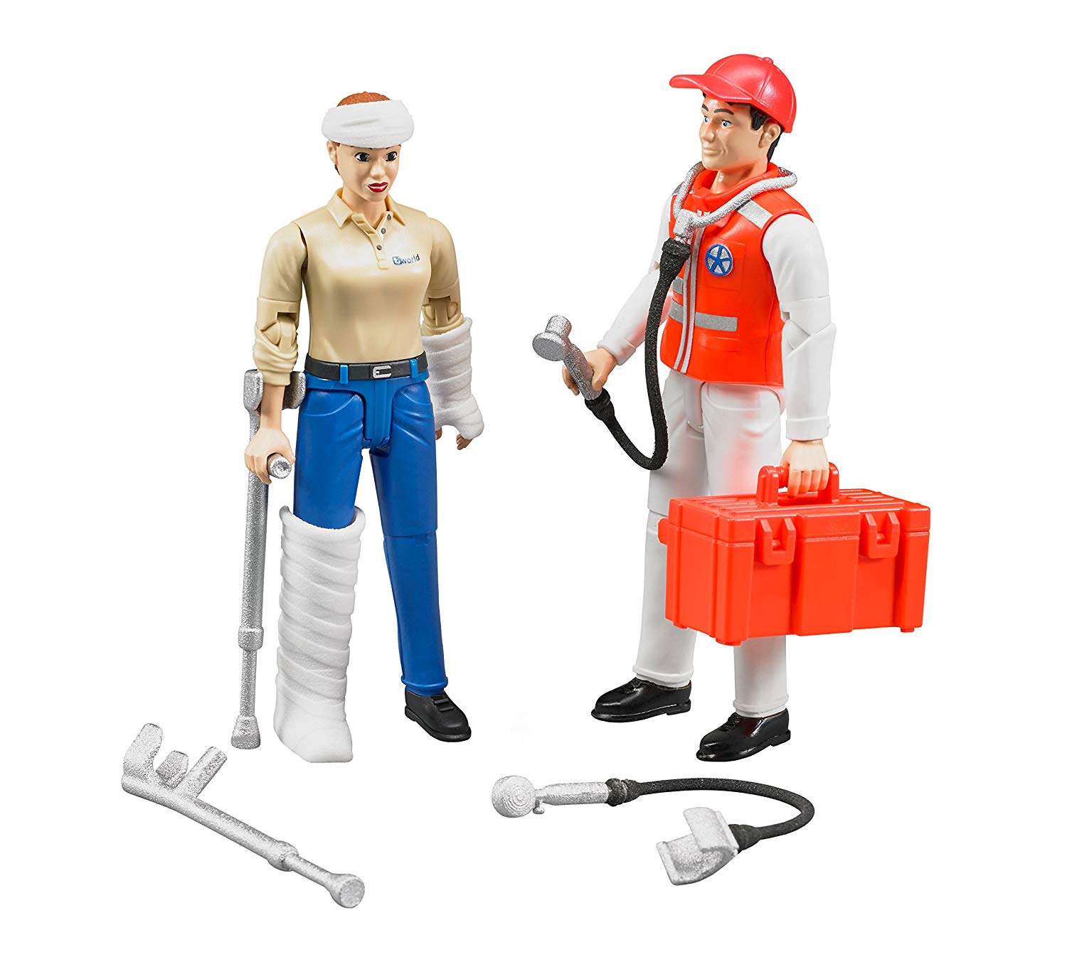 The emergency services figure set is the ideal supplement for any deployment of Bruder fire services, police and emergency services. The paramedic is perfectly equipped for medical emergencies. The figure can use the stethoscope on the included patient and measure the blood pressure. If necessary, bandages can be quickly applied and crutches support the healing process. Bruder spielwaren offer numerous emergency services vehicles and enhancing features to completely recreate emergency services deployment.