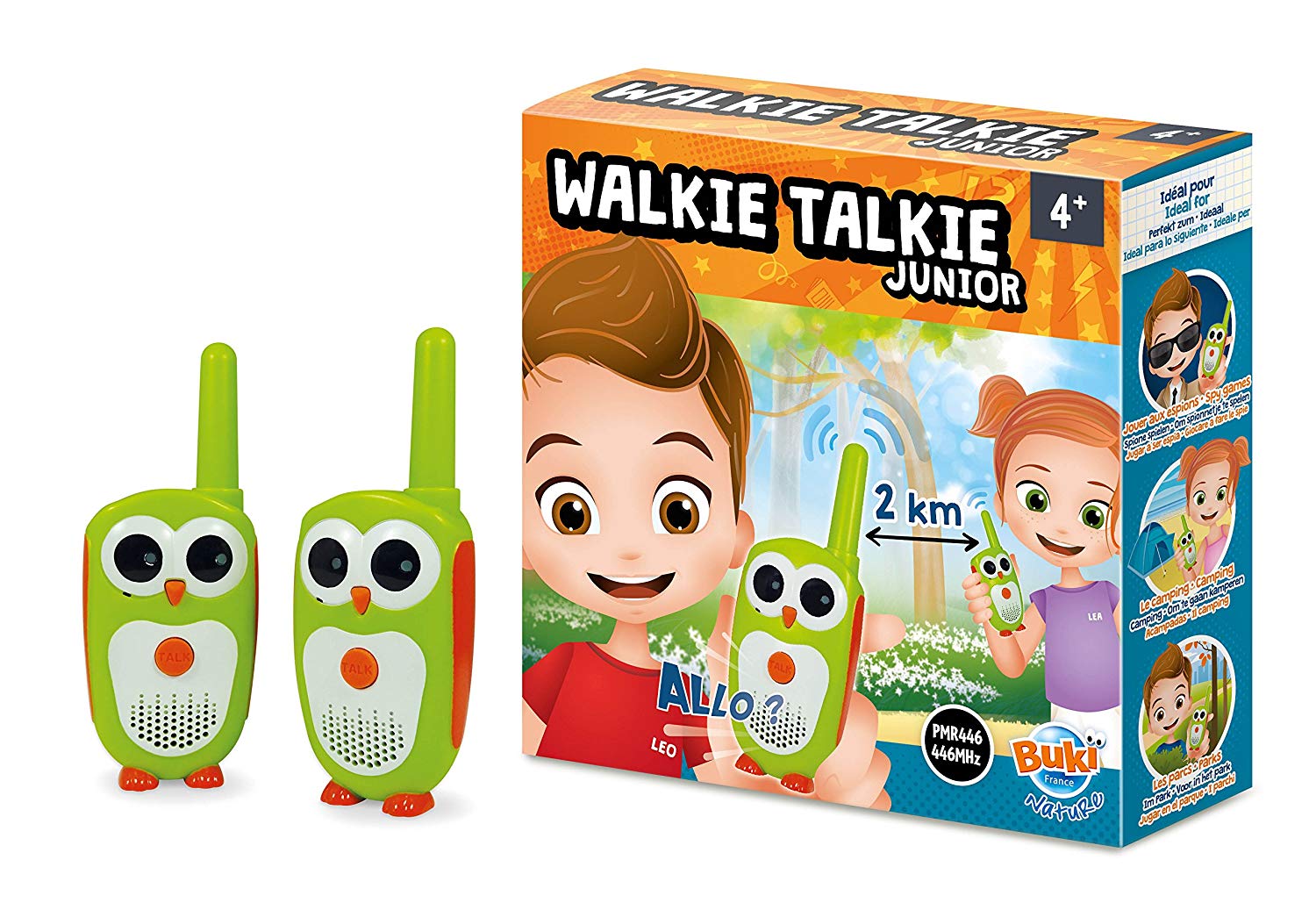 Walkie-talkies specially adapted for little hands, with a range of 2 km. Ideal for spy games, camping, parks, the beach. Compatible with Buki TW01 and TW02. 6 batteries AAA required, not included. Illustrated instructions included. Ages 4 and above