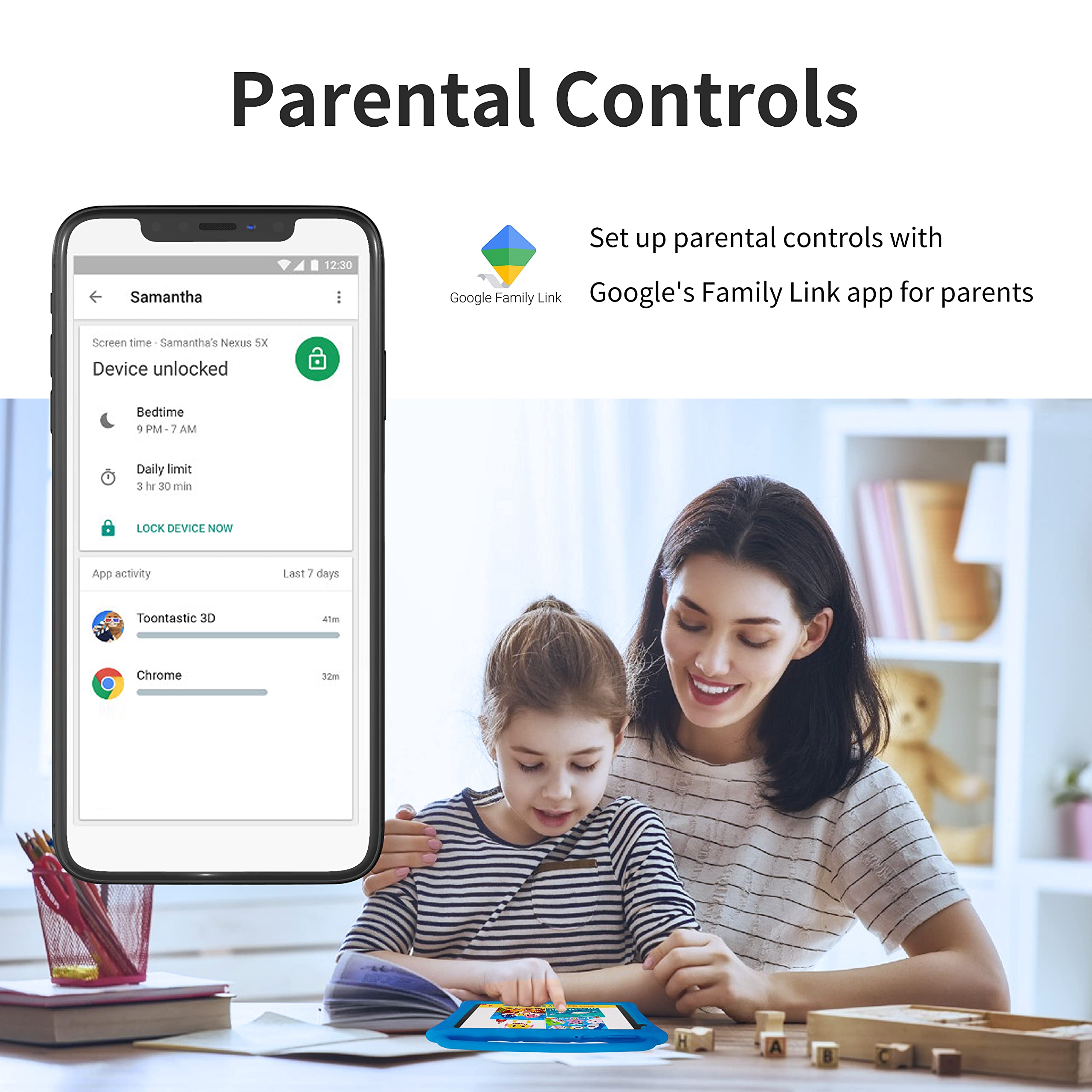 - Parental Control ModeSpecially designed for kids ages 3+, this kids tablet features a parent-controlled Safe Kids mode and regular Android. Parents can easily personalize the tablet’s screen time limits, filter age-appropriate content, download new apps, and manage playtime as your child grows.