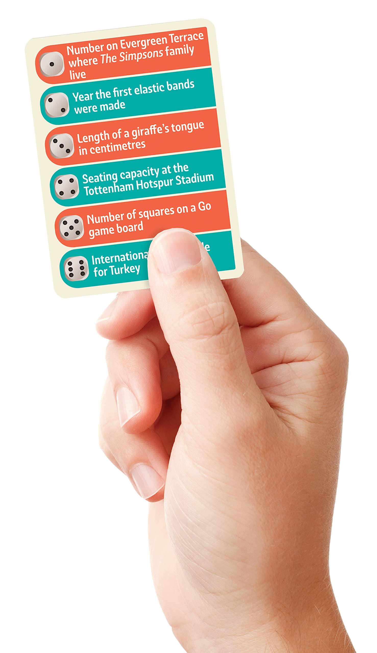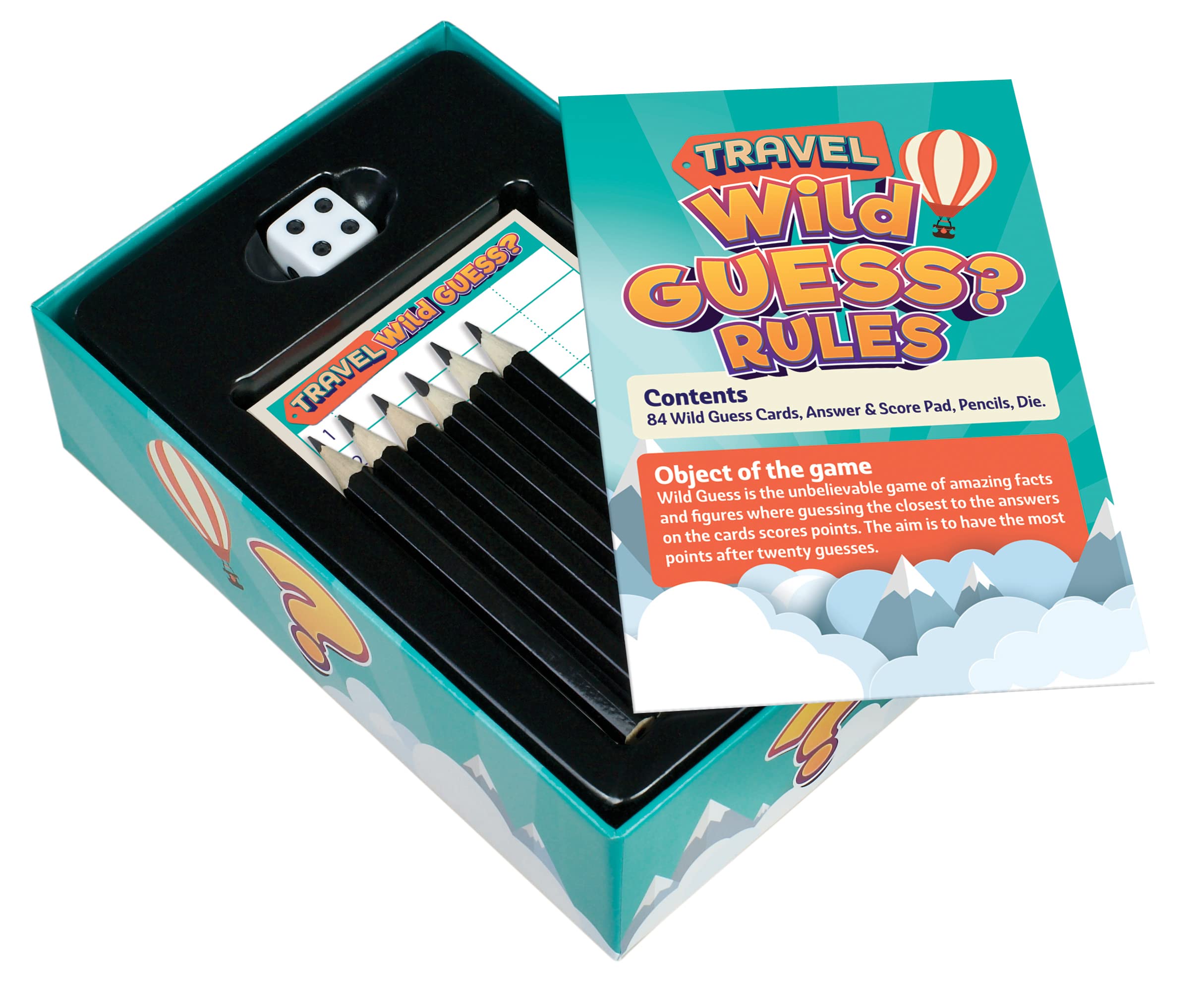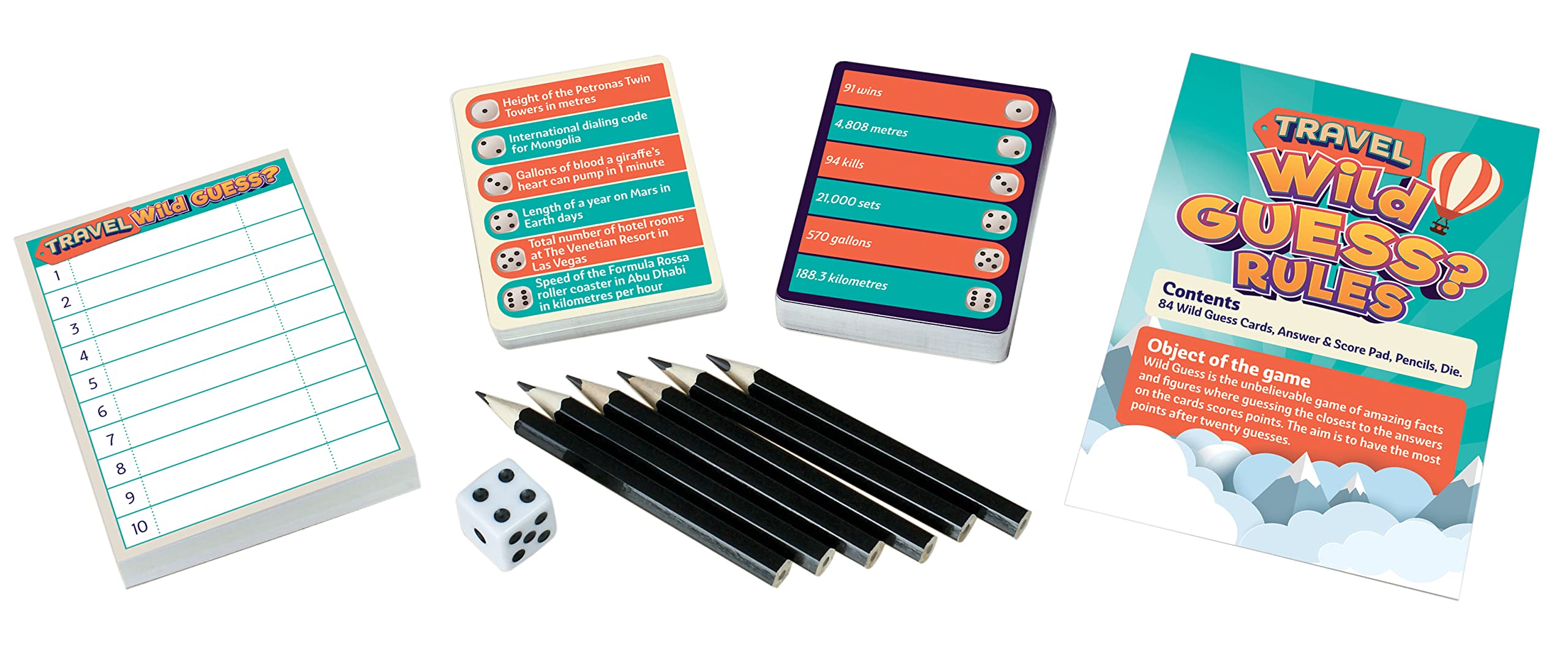 The guessing game to end all guessing games…Wild Guess is the incredible game of fantastic facts and fascinating figures where guessing the closest to a given answer on the card scores points. You don’t have to be exact…simply closer than your opponents! Whether working out a ballpark figure, following a hunch or just taking a stab in the dark you’re sure to be amazed at the unbelievable madness of the world we live in!