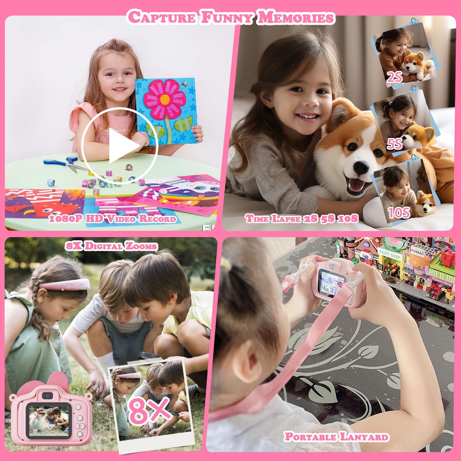 - Multifunctional fun camera: This camera has a variety of functions such as selfie recording, live video recording, time-lapse photography, games and music player. Easily share photos and videos with family and friends via USB data transfer. Perfect for capturing precious moments of childhood.