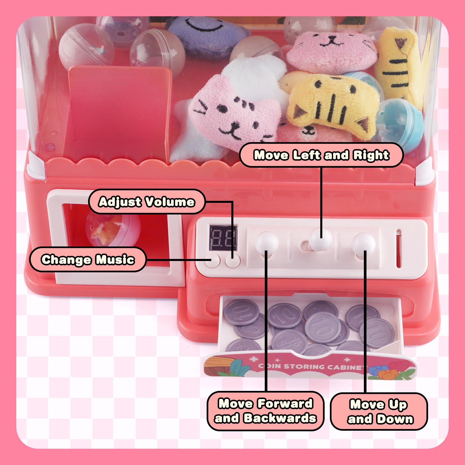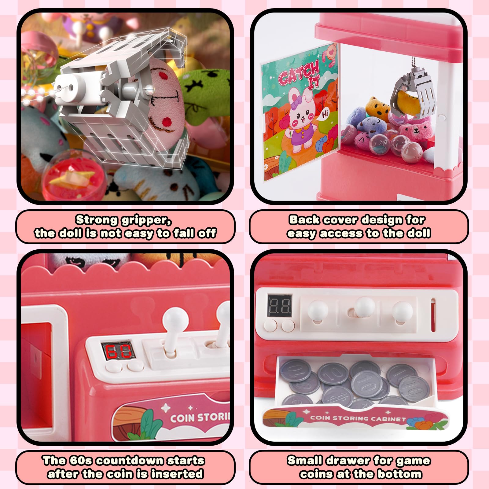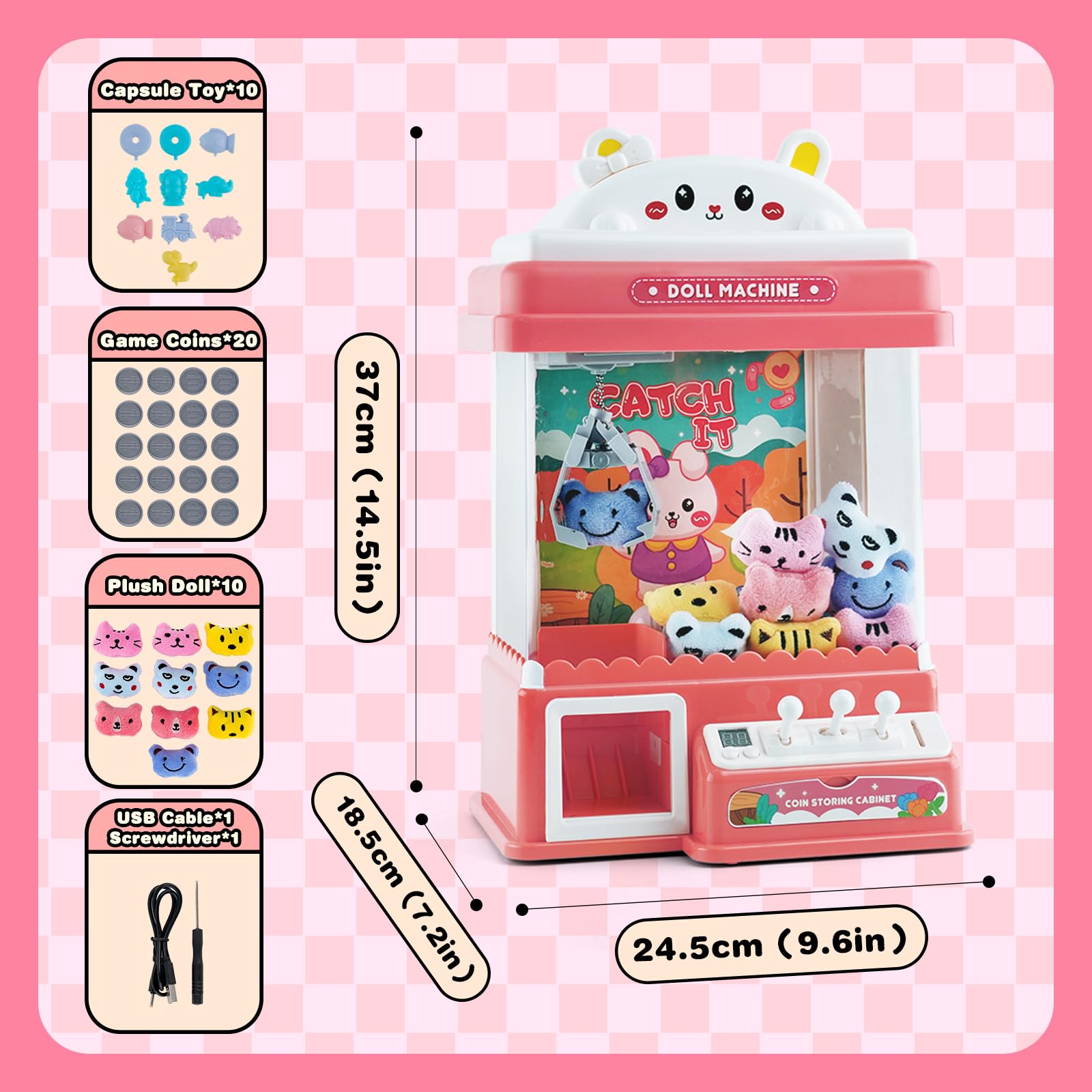 - Game Set IncludesThe appearance of this claw machine is a cute pink bunny.The size is only 37 x 24 x 18 cm (14.5 x 9.4 x 7.2 inches), which will not take up too much space. This game set includes 10 capsule toys, 10 plush dolls, and 20 coins. (Each capsule toy contains a random plastic toy). To let children have more fun, just open the door at the back of the claw machine, and you can freely put other prizes or candies into the claw machine to bring more small surprises to children