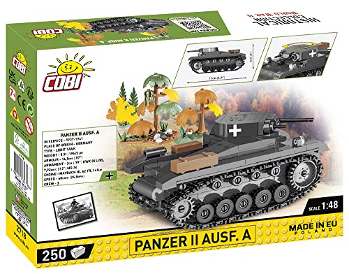 The Panzerkampfwagen II was a German light tank used in the first years of World War II. Until 1941, it was the main tank in armored divisions. Starting around 1942, due to the weakness of the armament, it lost its importance. It was used for reconnaissance and counter-insurgency tasks. A dozen or so versions of the PzKpfw II were created during the war. They were used until the end of hostilities on all fronts. A miniature vehicle made of COBI construction blocks was produced in the completely new 1:48 scale. The tank comes with elements of the environment in the form of block vegetation, so sought after by fans of blocks! The set is easy to build, so it’s perfect for the beginning of the adventure with Polish COBI construction blocks. It has a movable cannon, a rotating turret and working caterpillar traction. All graphic details are high-quality prints that do not wear off even during intense use. One of the advantages of the set is a design that uniquely reflects the original shapes of its historical inspiration. The Panzer II tank model will be perfect as a toy, but also a unique element of any collection of a fan of military and armored weapons. 250 high-quality pieces Produced in the EU by a company with over 20 years of tradition The blocks meet the safety standards of products for children Fully compatible with other brands of construction blocks Blocks with prints do not scratch or smear and do not fade during play or under the influence of temperature Elements of the environment and vegetation Model dimensions (L x H x W): 11 cm (4.3 “) x 5 cm (2”)