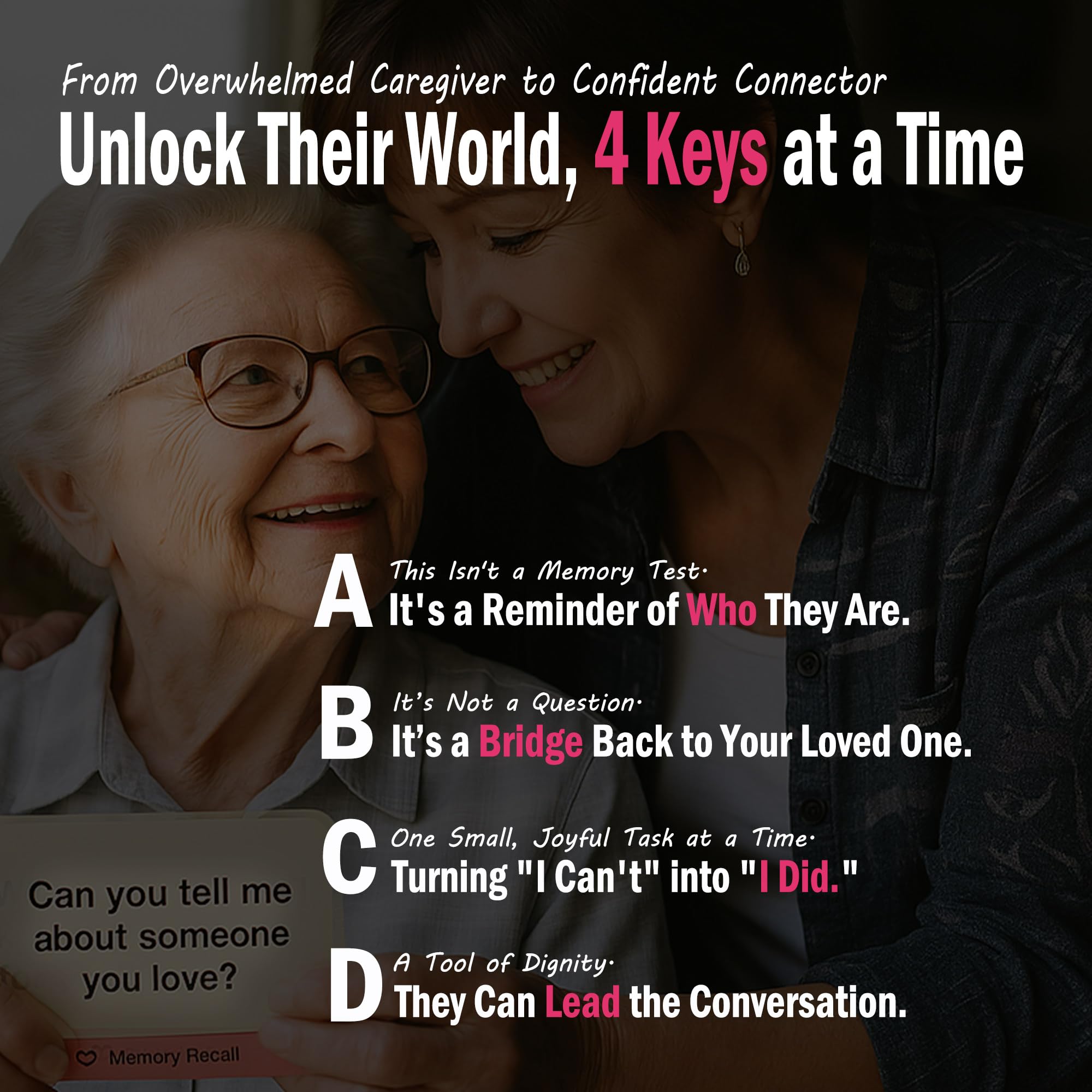 - 240 KEYS TO UNLOCK CHERISHED MEMORIES, NOT A STRESSFUL TEST – Designed with leading dementia experts, our unique system offers 4 gentle pathways to connect. (A) Spark Stories: with prompts like “What was your hometown like when you were young?” (B) Nurture Emotions: “What color makes you feel peaceful?” (C) Encourage Joyful Action: “Shall we listen to a song you love?” (D) Create Calm Clarity: “Let’s look out the window. What’s the weather doing?” You’ll never have to fear asking the “wrong” thing again.