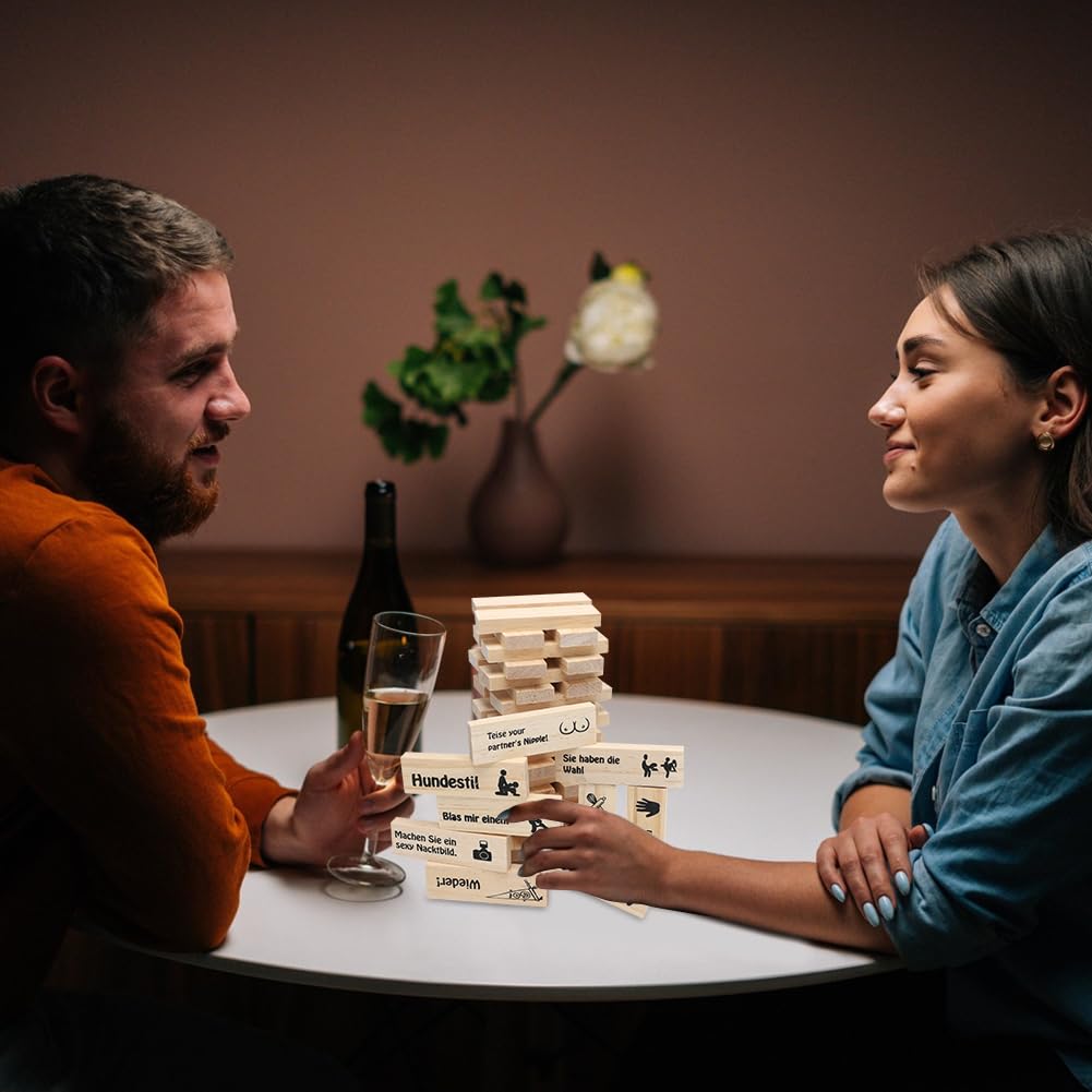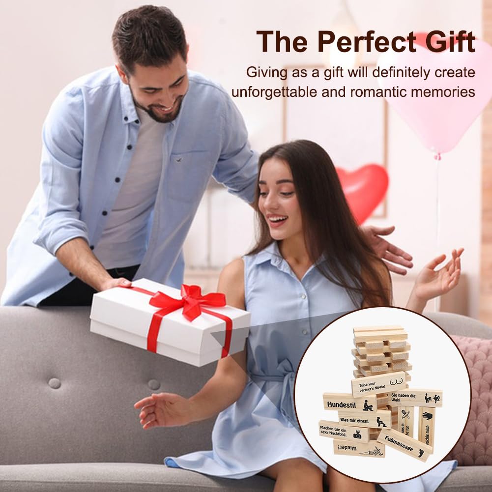 - Blocks game for adults: This couple game combines fun and intimacy and ensures unforgettable moments full of romance and laughter. Perfect for getting closer in a playful way and deepening the relationship. Ideal for dates or cosy evenings for two