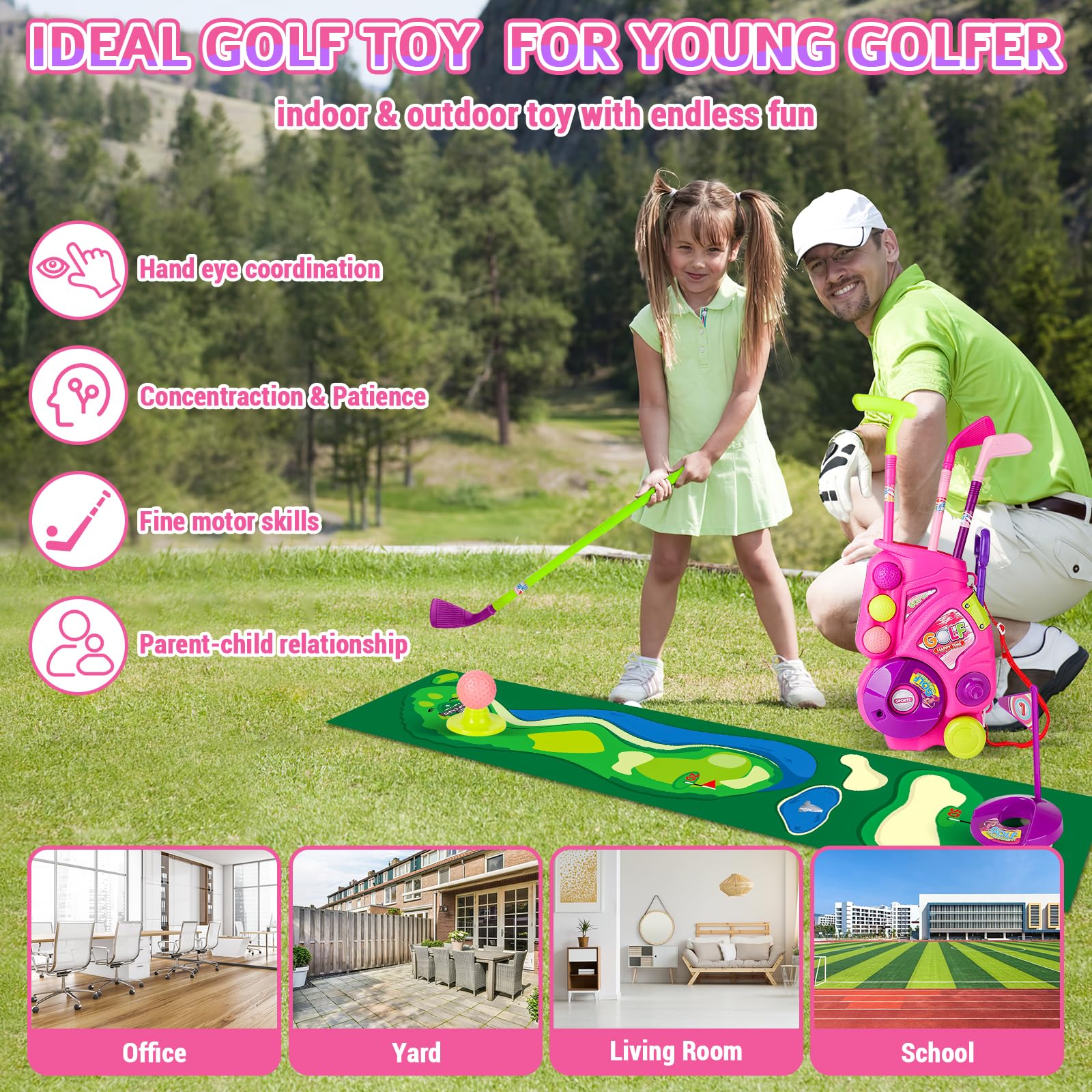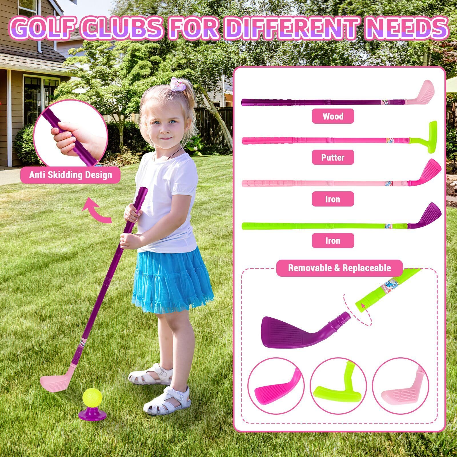 deAO Kids Golf Clubs Set, Portable Toddler Golf Set with 4 Clubs, 6 Balls, 2 Holes, 2 Flags, Indoor Outdoor Garden Toys Golf Set for Boys Girls 3 4 5 6 7 8 Years (Pink)