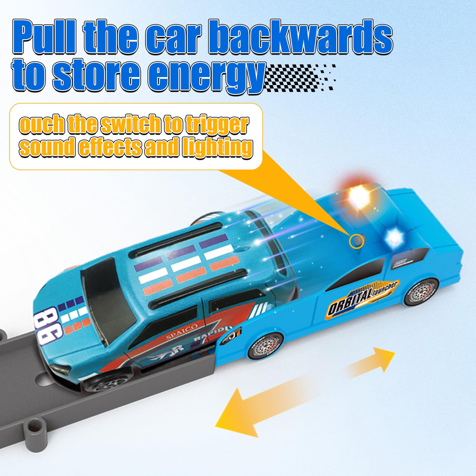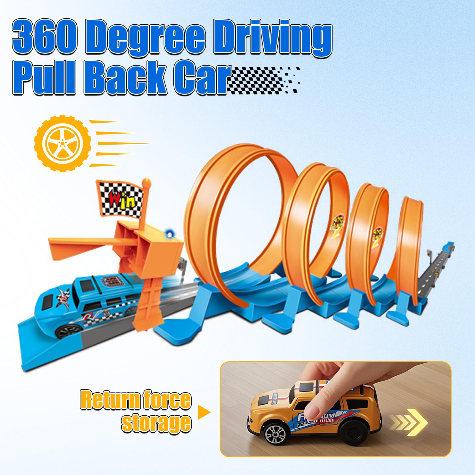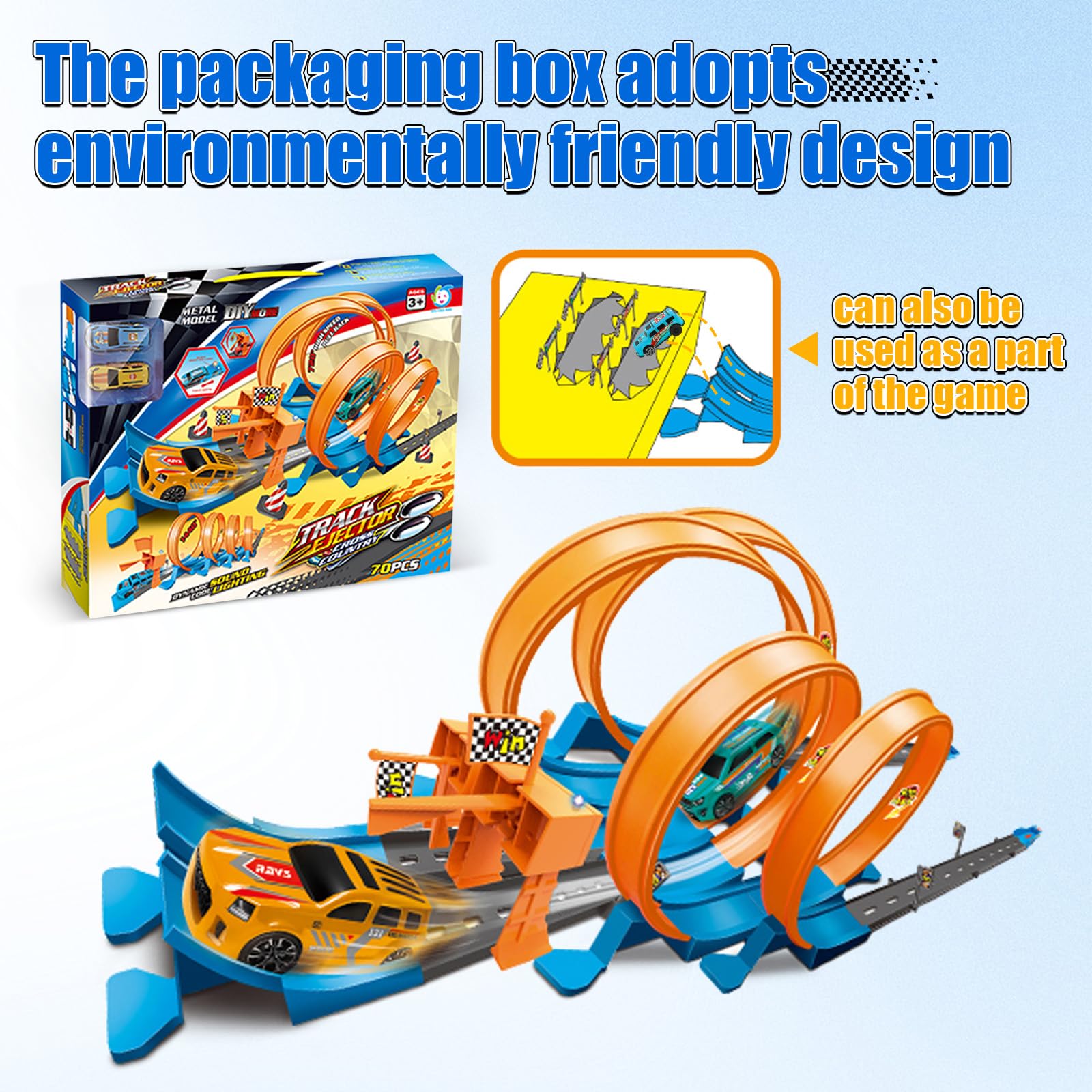 Delousiber 70 Pieces Toy Car Track Set with LED Lights & Engine Sounds, 4 Loops Raceway for Boys Kids Age 3-12, Gift Ideal Racing Game Toy
