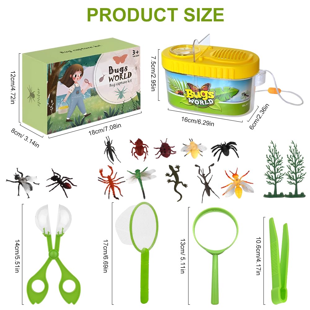 - Outdoor Adventure KitYou will receive 5 pcs bug hunting kits, including 1 magnifying glass, 1 tweezers, 1 insect catching scissors, 1 butterfly net, 1 insect observation box, 12 fake insects and 2 trees. They are great start kits to explore nature games.