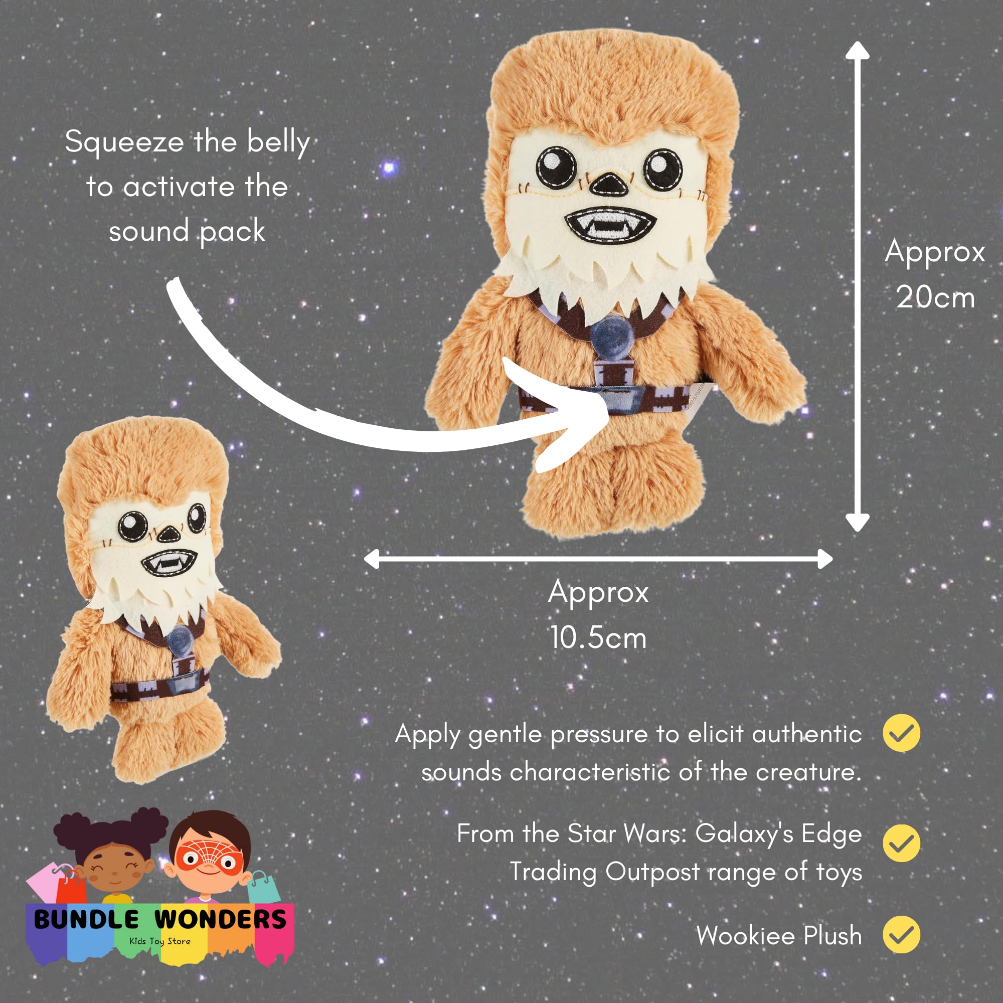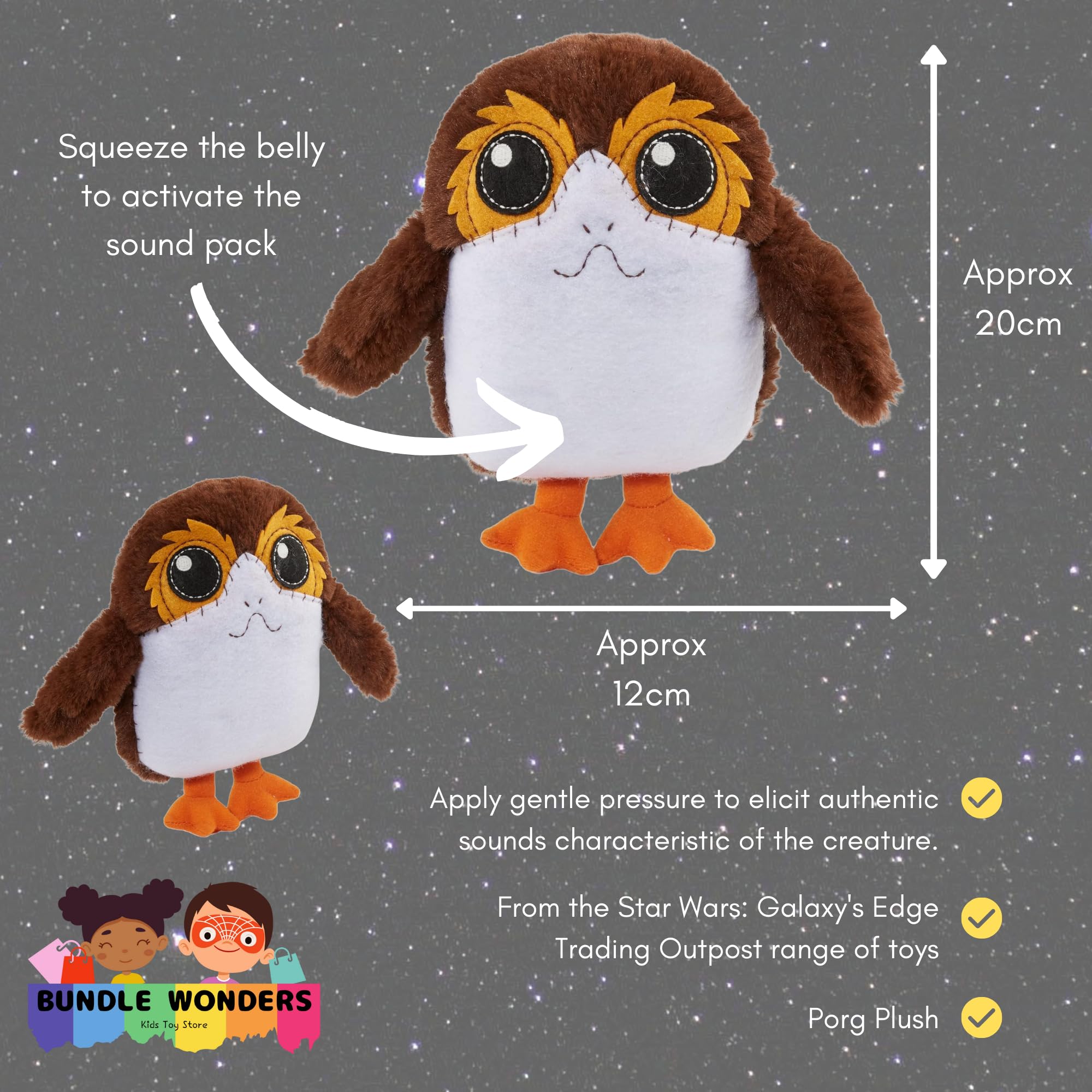 Dive into a galaxy far, far away with our exclusive Star Wars plush toy collection, designed to delight fans and collectors alike. This unique set includes two beloved characters from the Star Wars universe: a charming Porg and a fearsome Wookiee. Each plush is crafted with attention to detail, featuring a variety of fabrics that bring the textures of their on-screen counterparts to life. Not just visually appealing, these plushies come equipped with a sound box, allowing you to hear authentic creature noises at the push of a button, providing a truly immersive experience.