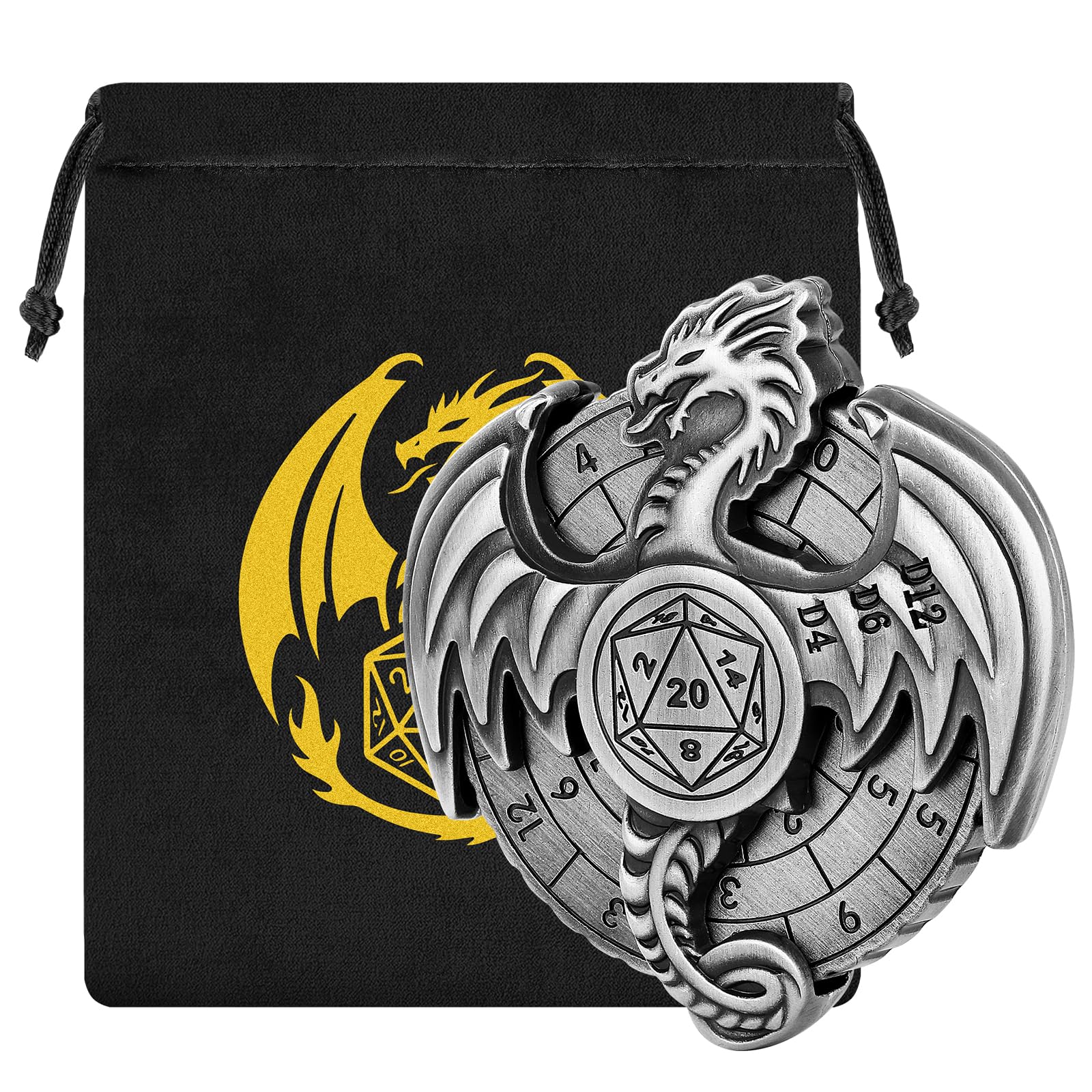 DND Dragon Metal D&D Dice Spinner – 7-in-1 Fingertip Gyro Roulette With Logo Gift Bag – Role Playing Board Game Accessories, Silver
