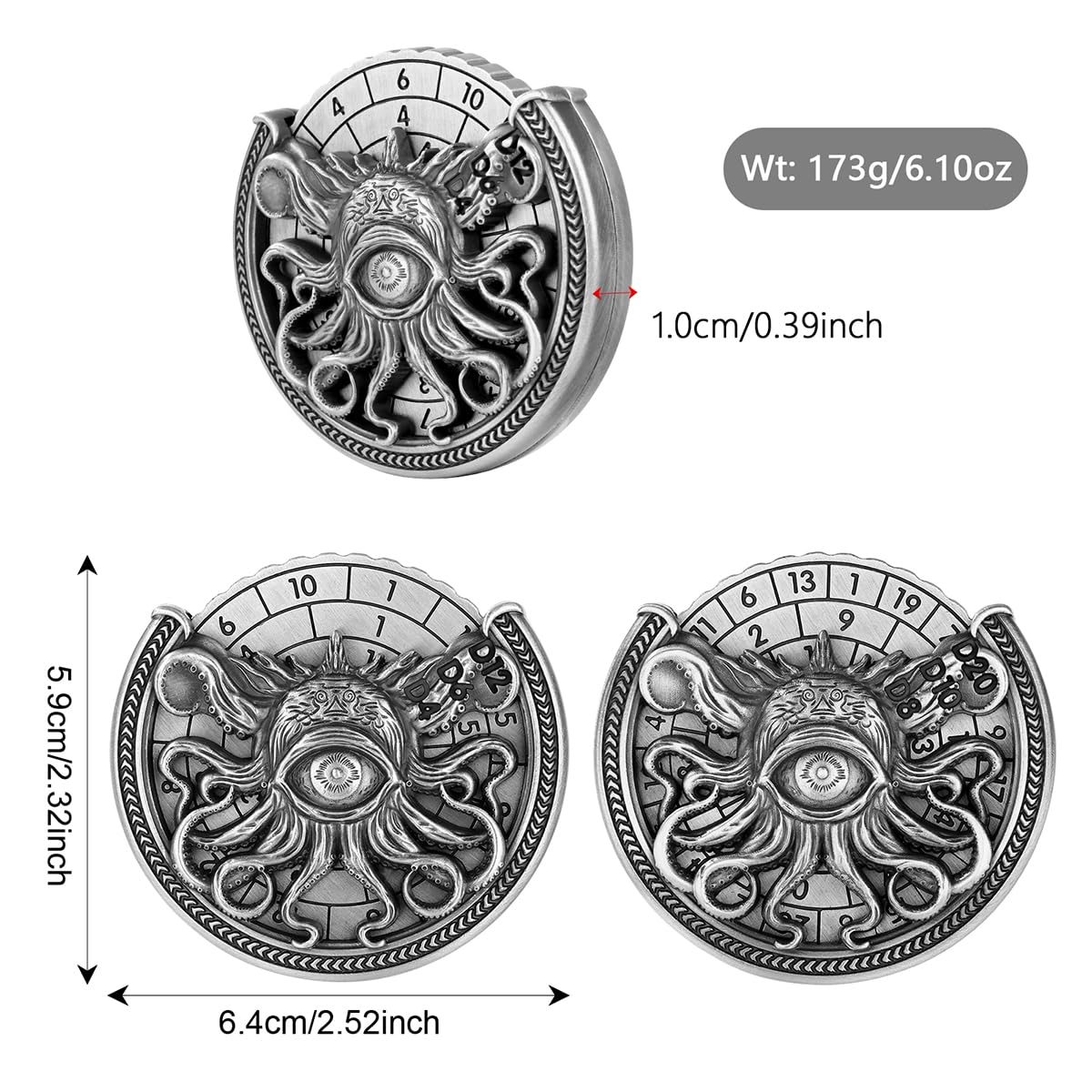 - Unique Design:This 7-in-1 metal dnd dice set roulette dice spinner stands out with its innovative combination of a compass and rolling dice, offering an unparalleled stimulating experience. The spinner features intricately cyclops octopus . epresenting different sets of dice, including D20, D10, D8, D12, D6, and D4
