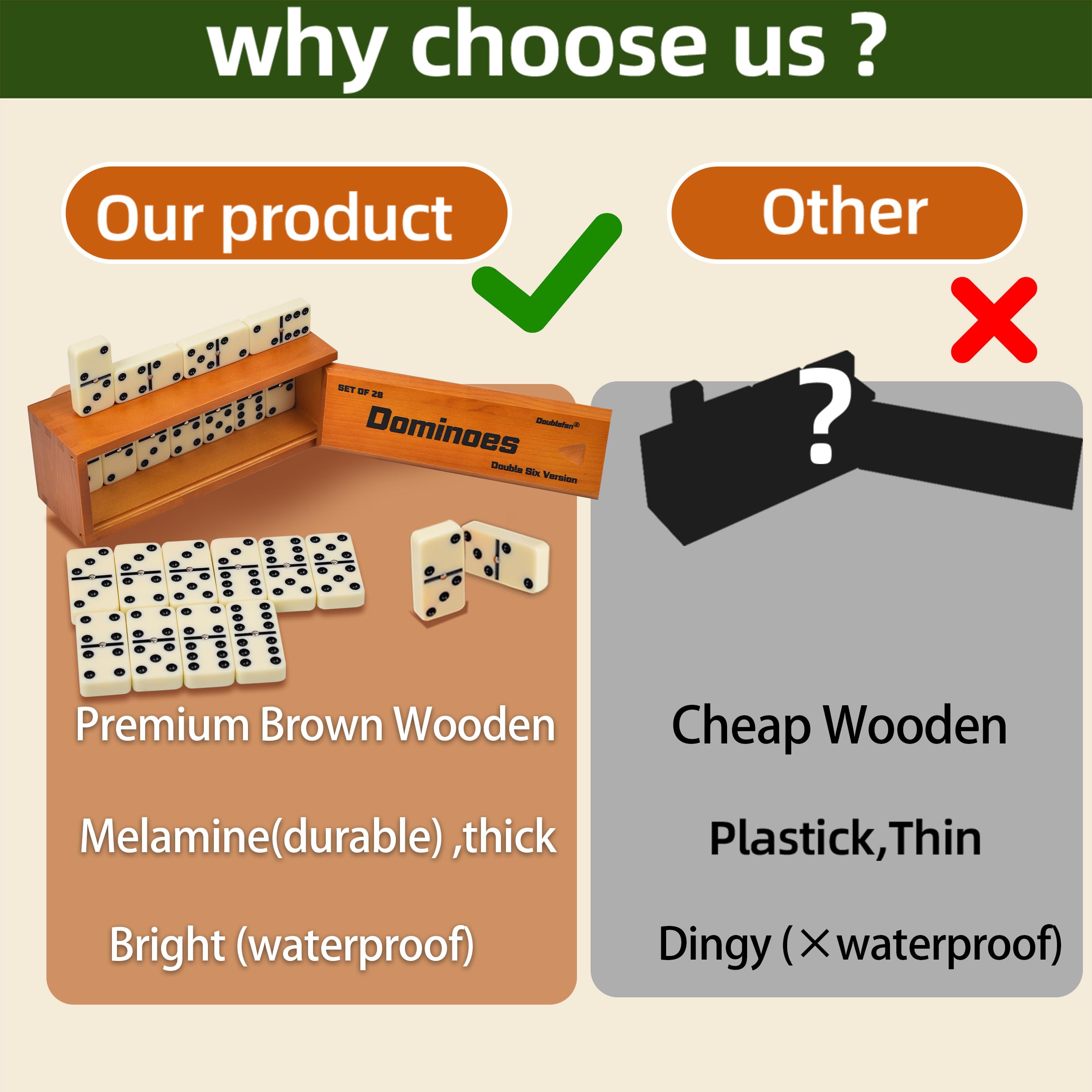 - MORE FUNNY GAMESDouble 6 dominoes set providing fun of hours for families, friends and kids. It can freely arranged different shapes and piled up. Whatever play Chicken Foot or Mexican Train games, that is really best choice!