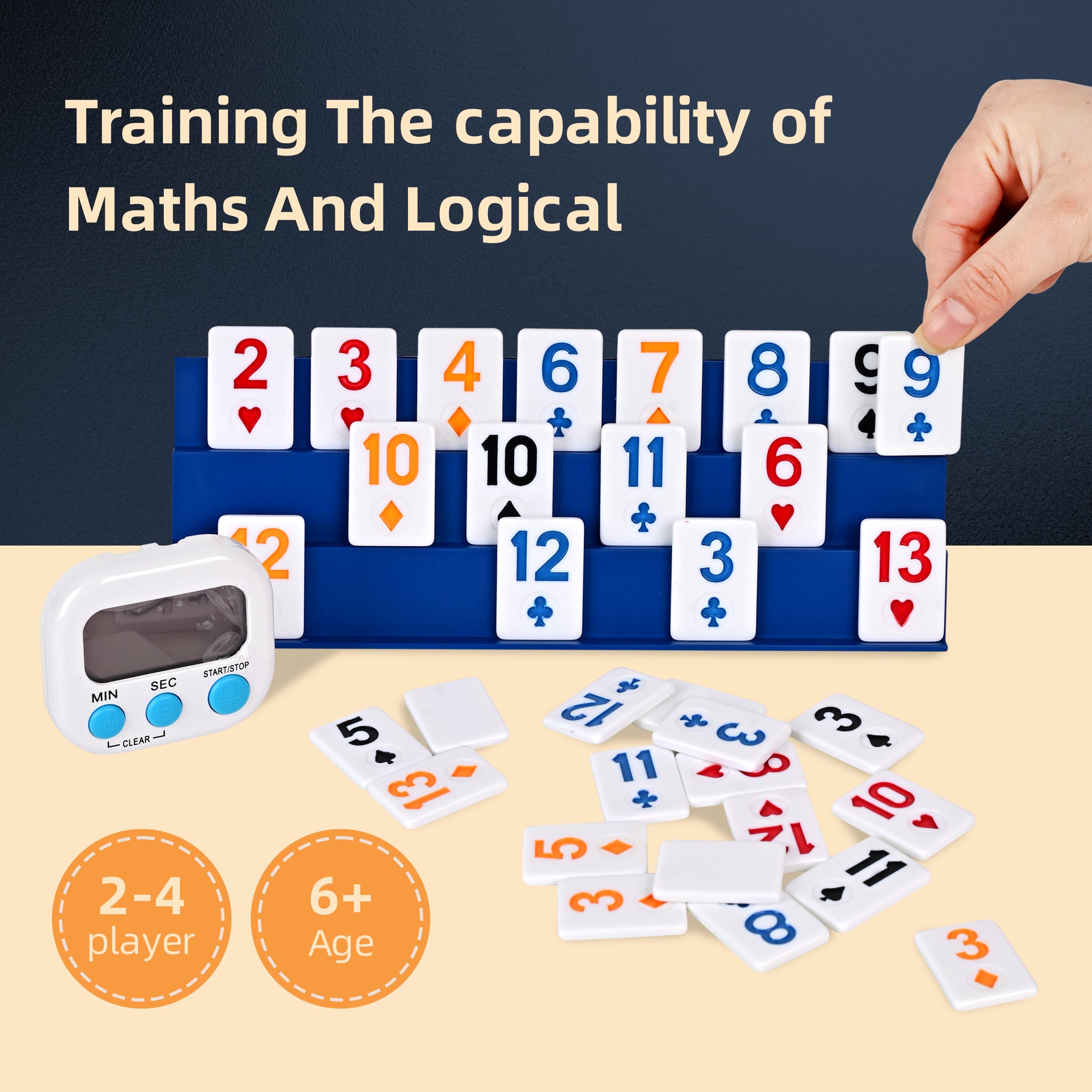 - [Rummy Cube Complete Set ] – Rummy Cube Board Game comes with 106 tiles (2 sets of tiles numbered 1 to 13 in four colors + 2 Jokers), 4 playing tile holders, dots dice, 1 timing, detailed instructions, Portable Paper Box.