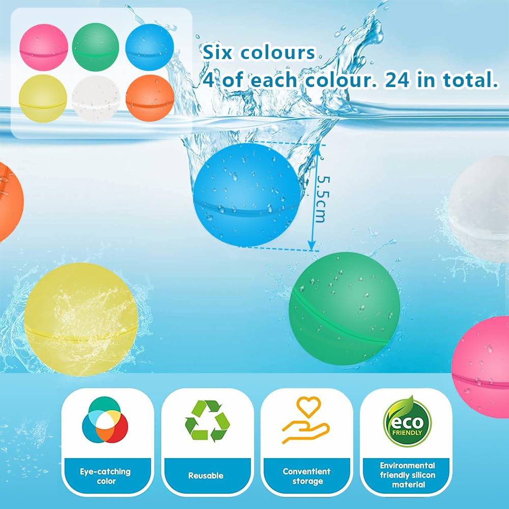 - Water Balloons Bombs SetPackage includes 24 colorful water balls, 6 colors, each ball is about 5.5cm, the right size makes it easier for baby to pick up and release the ball. Enough quantity and color for daily use.