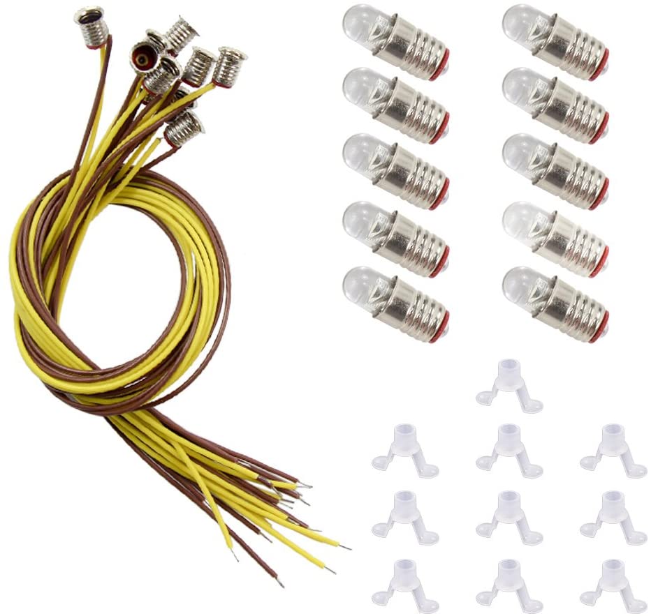 Features:100% Brand new and high quality E5 LED is very helpful props for model train Layout and building, train station layout ,school project model and train boardntages: longer life expectancy, lower heat generation, less power consumption than conventional light bulbs LED lamps replacing conventional incandescent lamps with a E5,5 threads, such as those used numerous modeling applicationsly any heat radiation, thus no “brown spots” of plastic parts LED lamps can easily replace the bulb. Especially in narrow doll houses or model cars, the subject heat generation is very important LED lamps produce almost no waste heat and power consumption is much lower than that of the conventional bulbs service life is much longer, because the LED bulbs have a life expectancy of 100,000 hoursible applications:Streetlights,Locomotives,Wagons,Cribs lighting and so onifications:Brand:evemodel:E5age: 12V to 14V DC voltageent: 20mAting color:Bright Whiteht:approx 14mmeter: approx 4.5mmage included:10pcs White E5 LEDS.10pcs The Copper Stand of the LEDs.10pcs Plastic fittings.