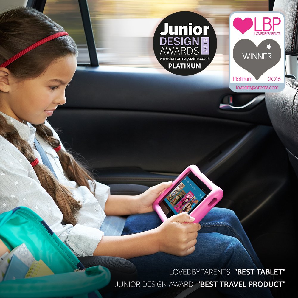 7″ display, quad-core processor, kid-proof case, front and rear cameras, and microSD slot for additional storage up to 200GB