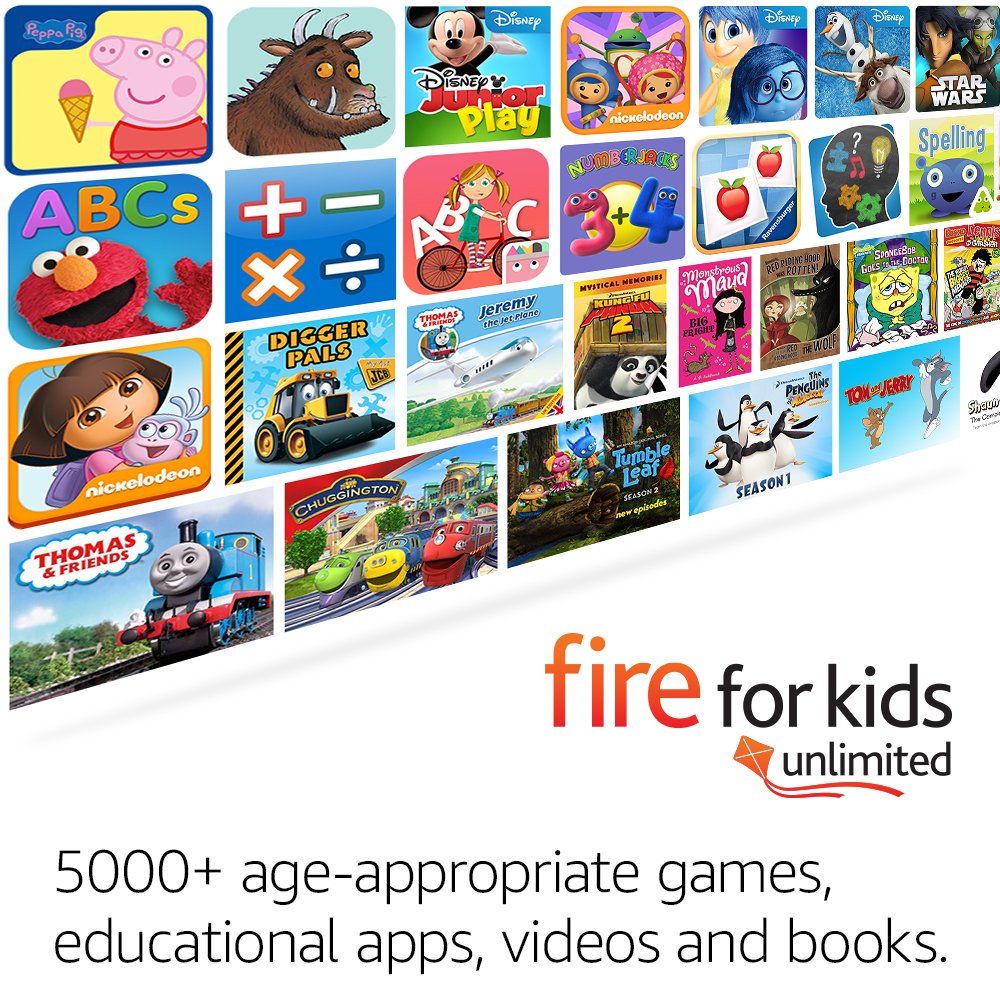 Comes with 5000+ age-appropriate games, educational apps, videos and books with 1 year of Fire for Kids Unlimited included