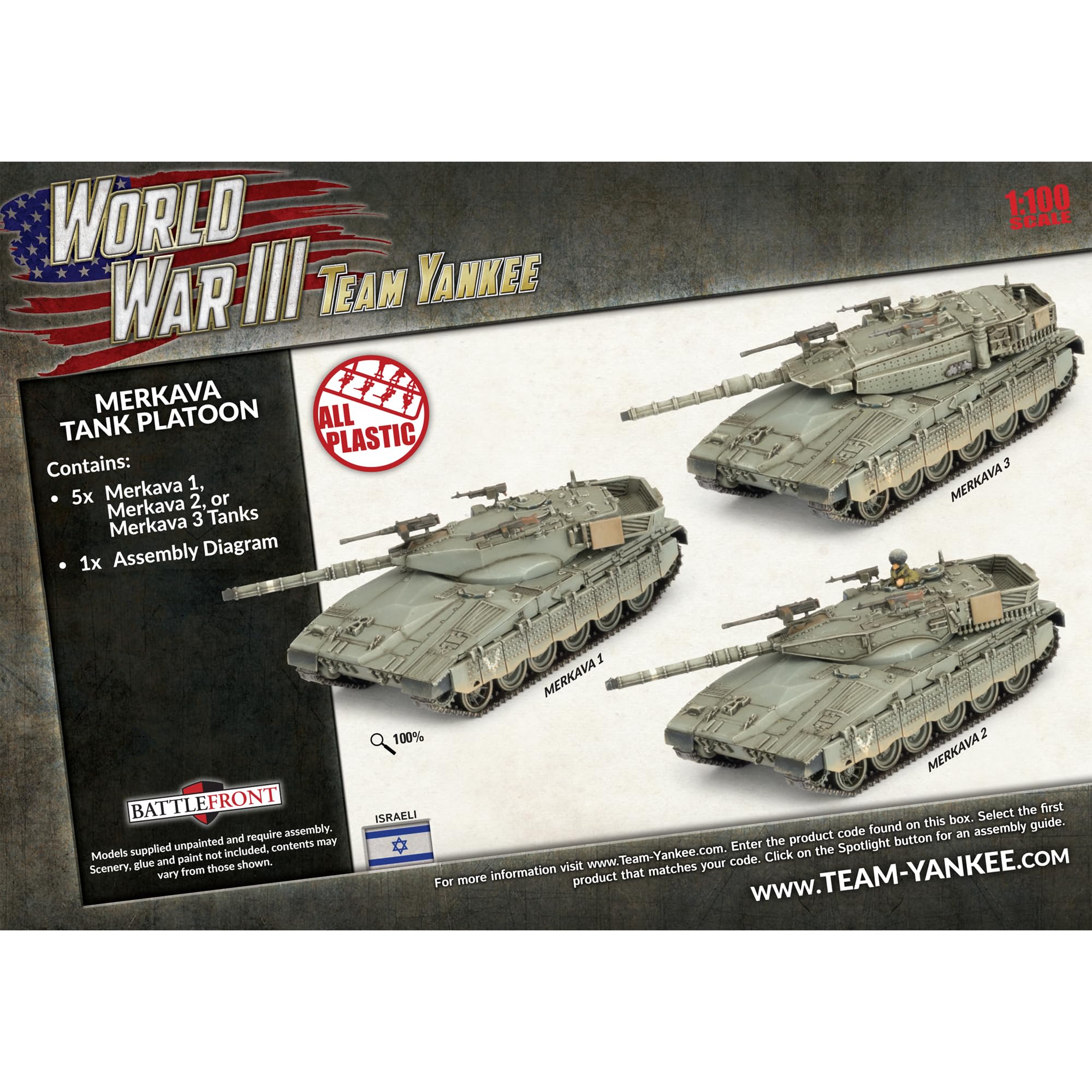 The Merkava 3 Tank Platoon box contains 5 highly detailed plastic kits allowing you to make all 3 variants of the Merkava. Models require assembley and painting
