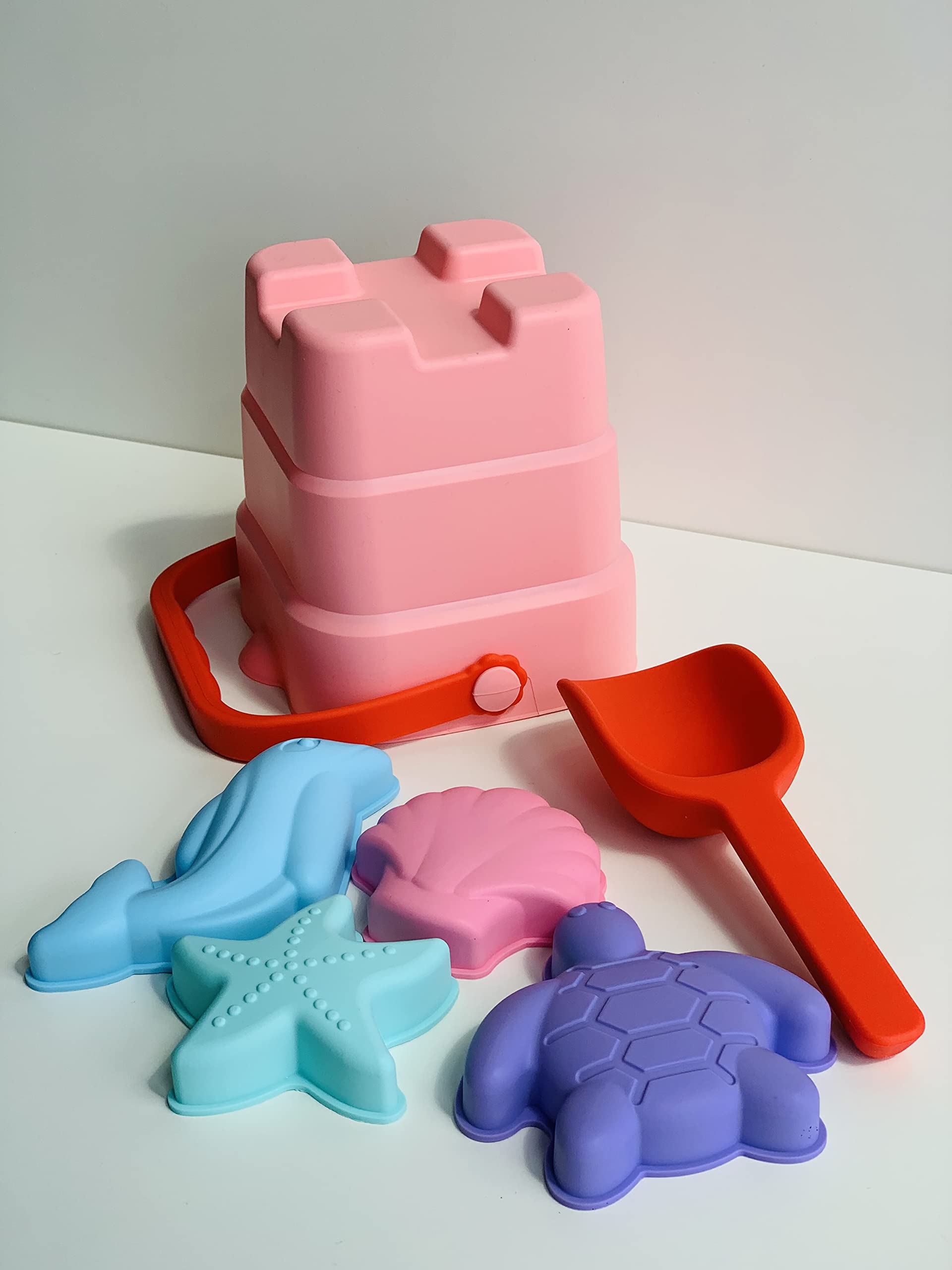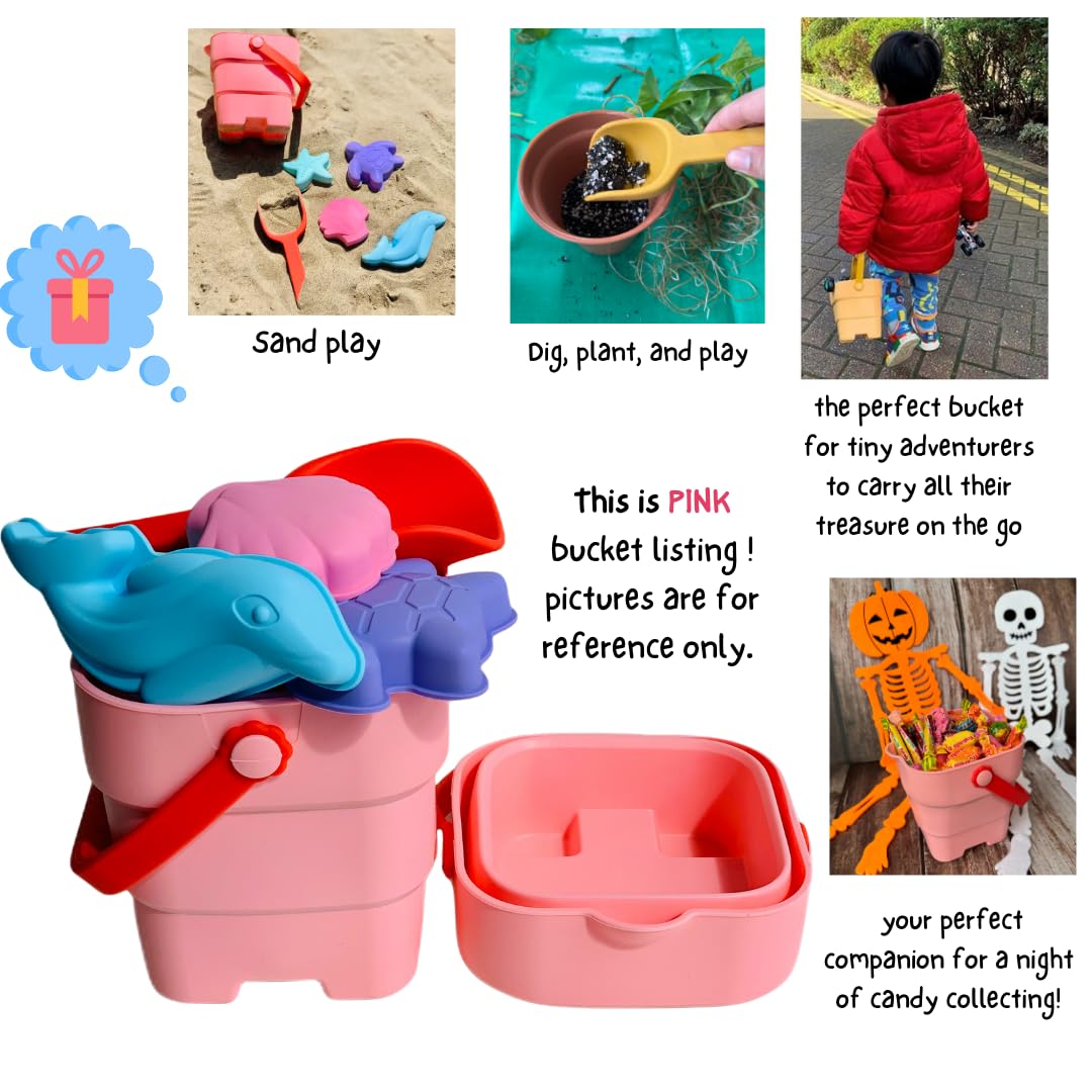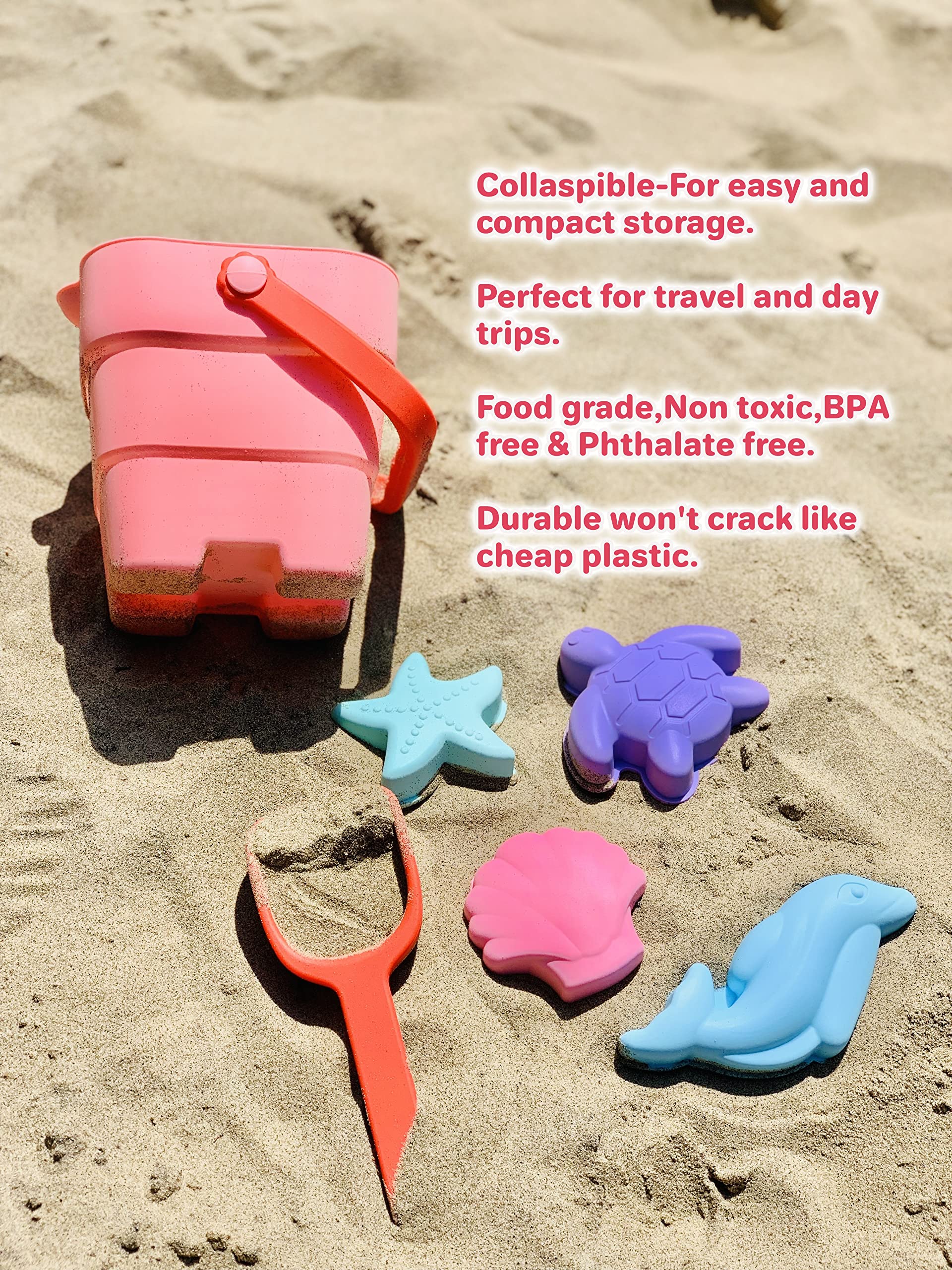 Foldable Beach Bucket Toy Set (6 pieces) – Silicone Collapsible Beach Toys for Kids, Scrunch Bucket, Castle, Sea Animals Molds, Toddler Travel Sand Toys set, Sandbox Toy (Pink)